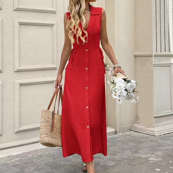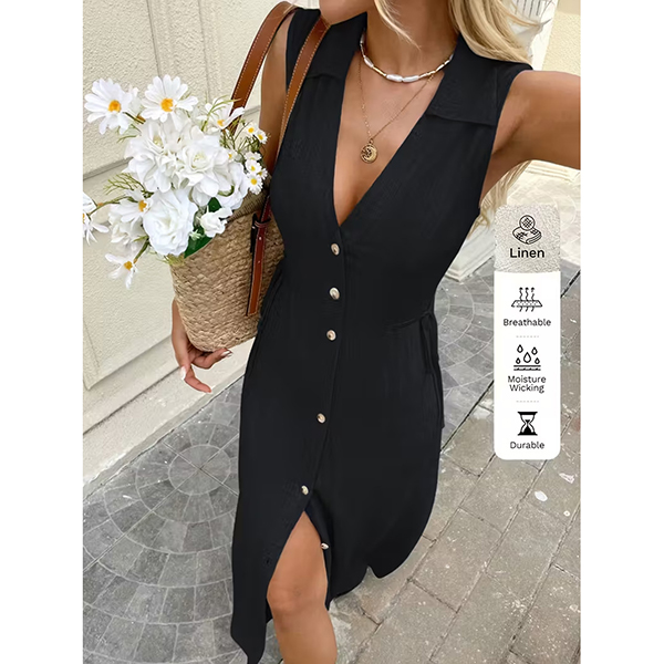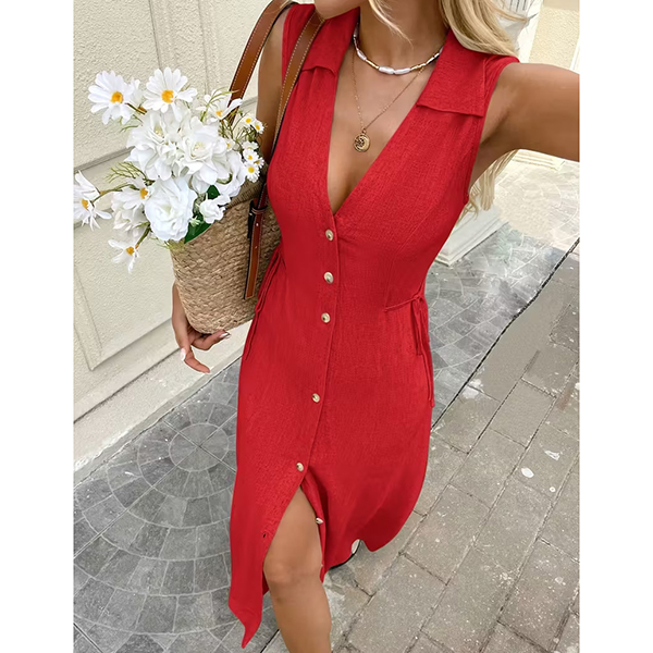 Boho-chic Lapel Collar V-neck Front Button Sleeveless Side Drawstring Dress