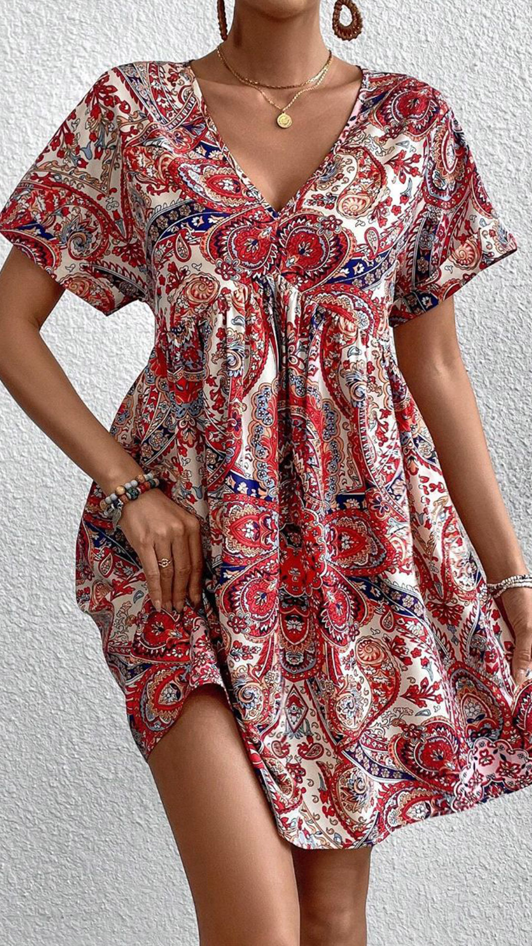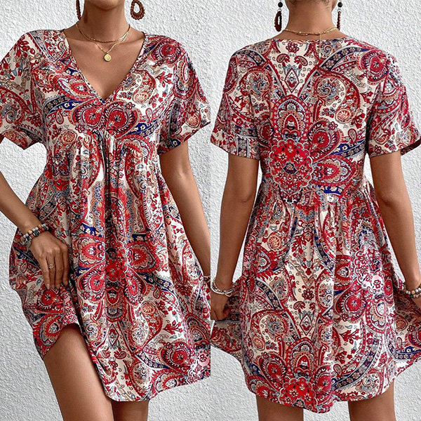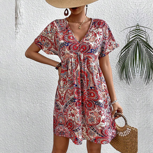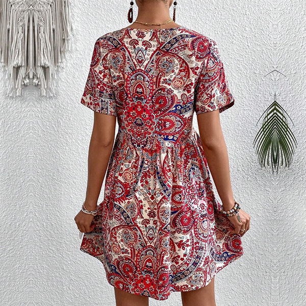 Boho-chic Paisley Printed V-Neck Short Sleeve Mini Dress