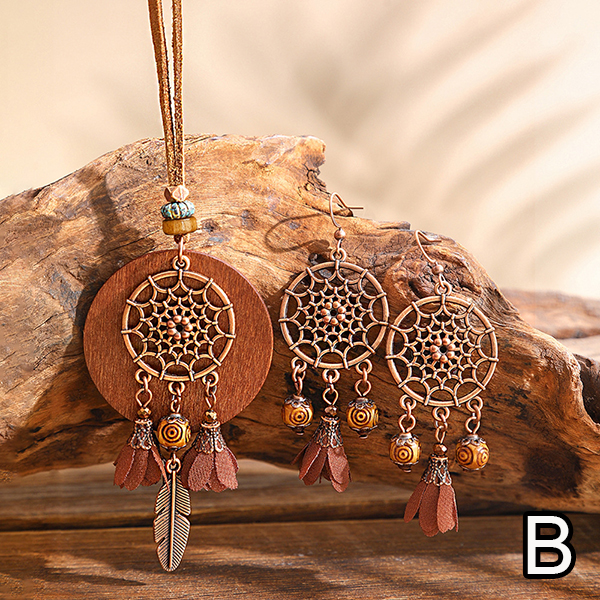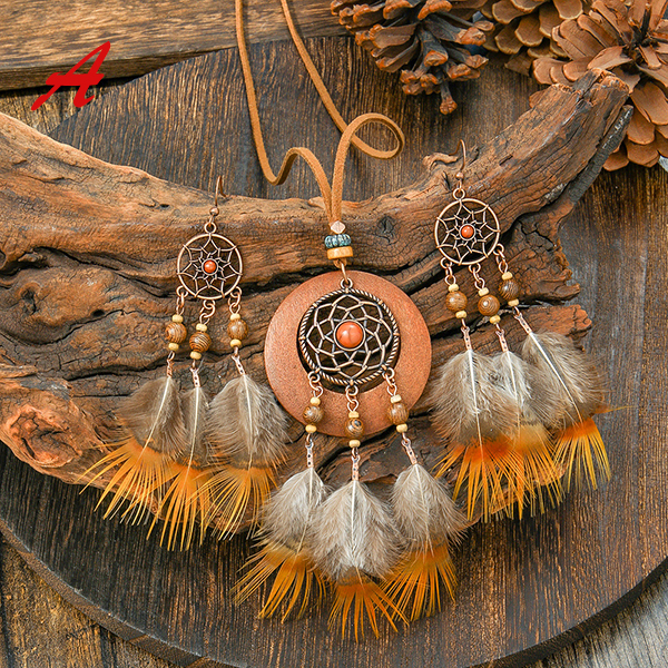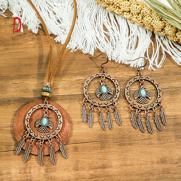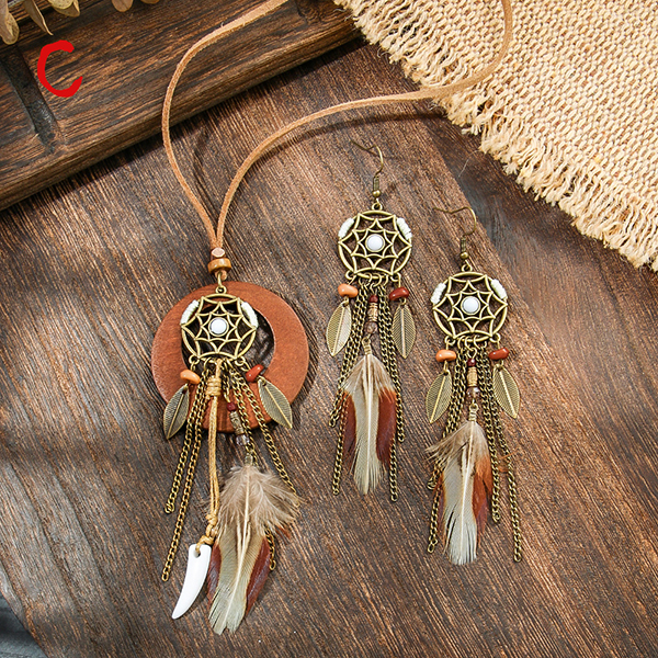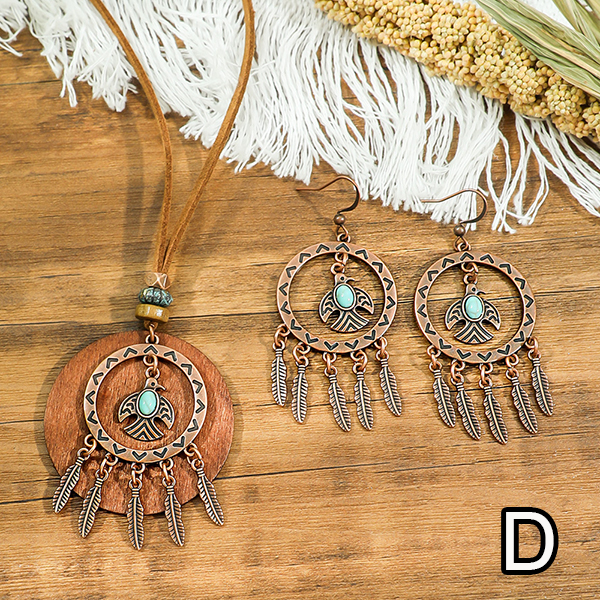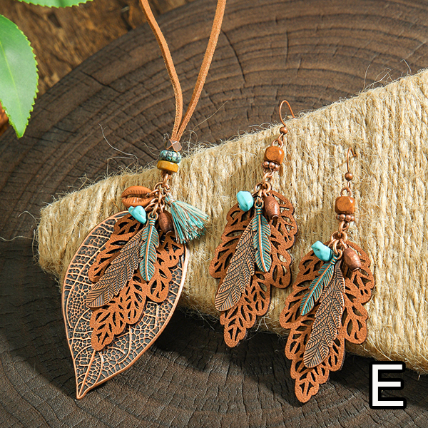 Boho-chic Tassel/Leaf Pendant Jewelry Set incl Neckline and Drop Earrings