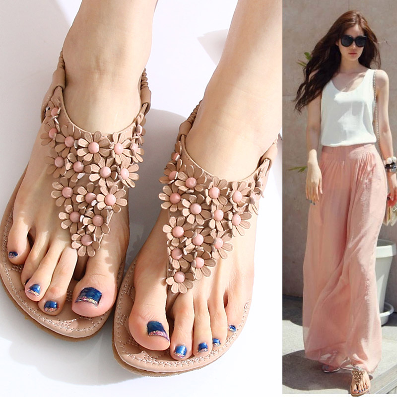 This pair of Bohemia style sandal is embellished with flower trinkets and beads at the front strap,a faux leather upper and a durable rubber sole.It's sure to be one of your favourites this season.