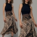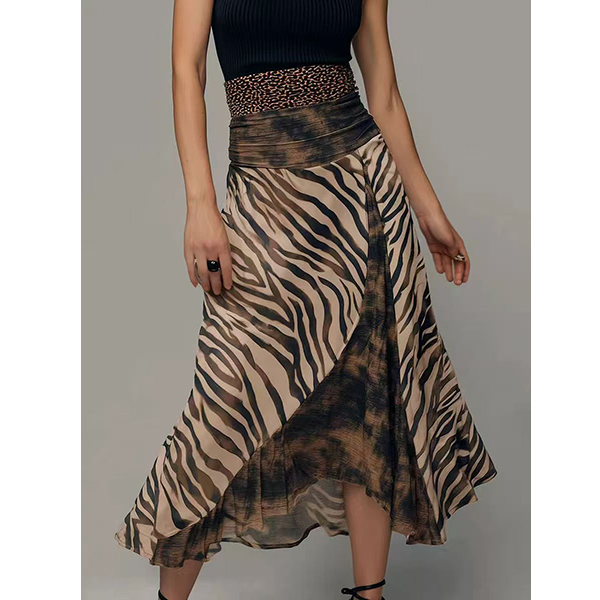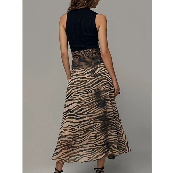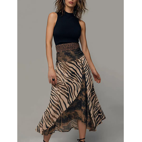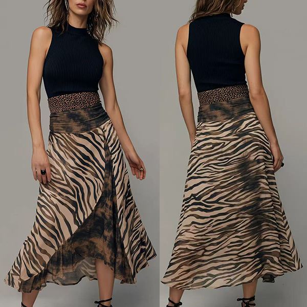 Look at this dress! This dress is designed with a "mixed media" approach, combining two distinct textures and styles into one cohesive look. The top features a fitted, solid black ribbed knit bodice with a high crew neckline, offering a slimming silhouette that highlights the shoulders. This transitions seamlessly into a defined waist accented by a leopard-print band. The skirt flows out into a breezy, A-line shape featuring a striking zebra stripe pattern with subtle tie-dye undertones. The asymmetrical, handkerchief-style hemline adds movement and grace with every step. Wanna have a try?