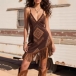 Brown Southwestern Fringe Mini Dress - V-Neck Cami with Aztec Geometric Print & Asymmetrical Hem
