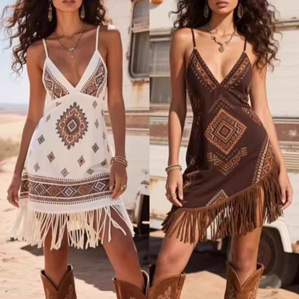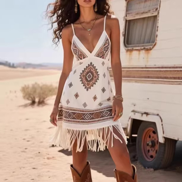 Look at this dress! Striking Aztec geometric patterns create vibrant visual impact, while playful fringe detailing adds movement and authentic western flair with every step. Ideal for music festivals, country concerts, or anywhere you want to make a statement with boho-western confidence.