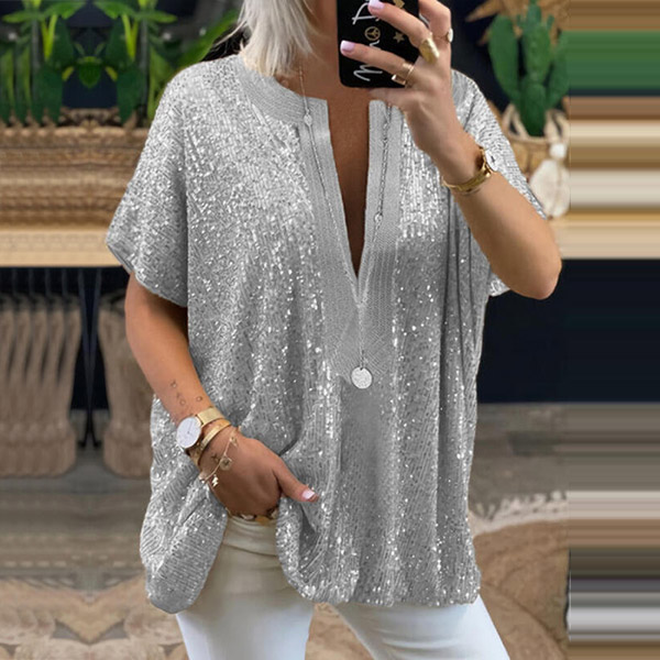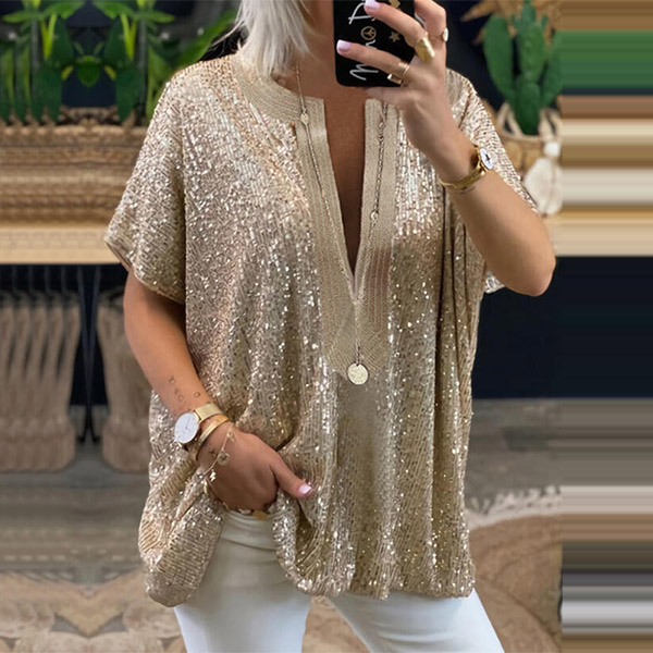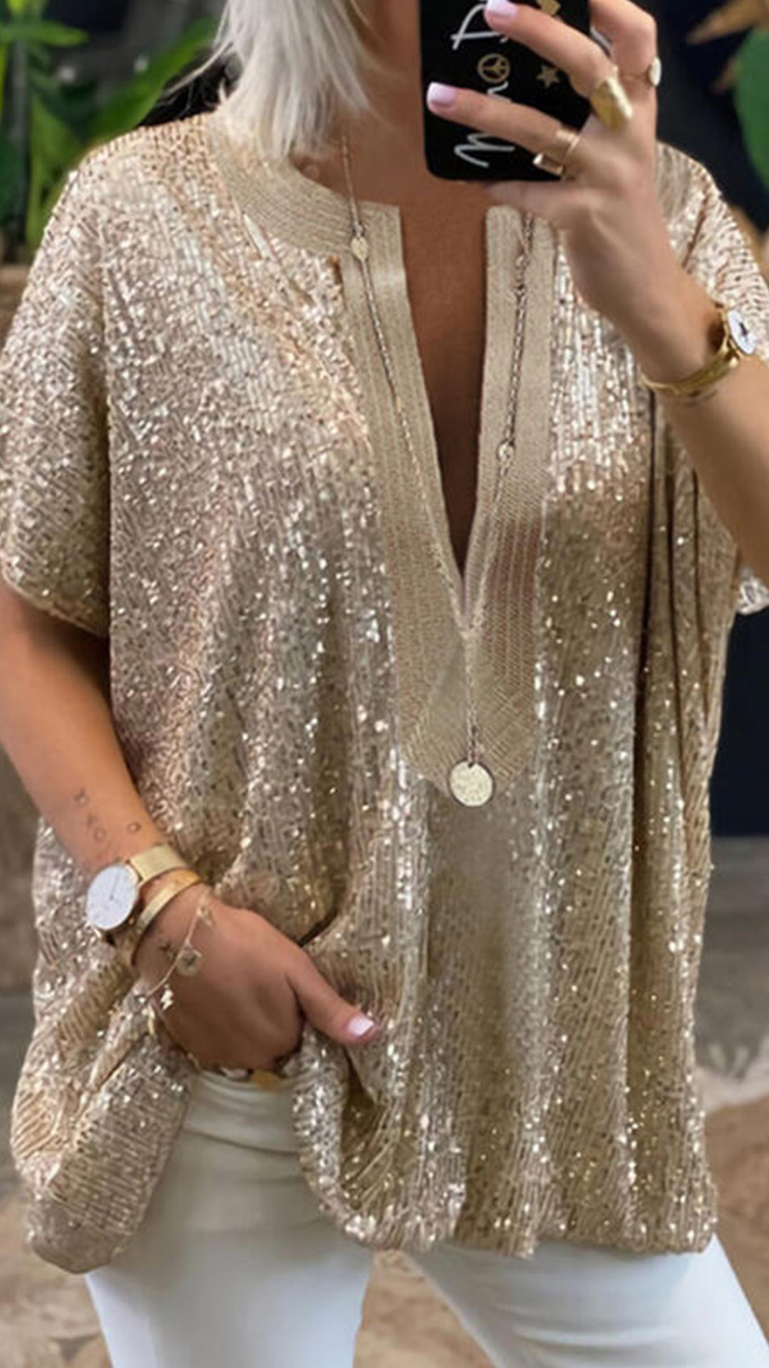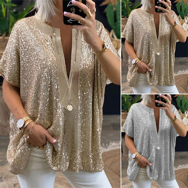 Regardez cette chemise ! Le motif pailleté bling-bling ajoute une touche d'éclat et de glamour, tandis que le col en V fendu ajoute une touche d'élégance et de sophistication.