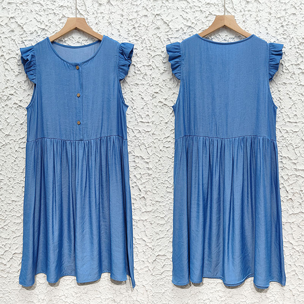 This mini dress features a round neckline, offering a classic and timeless look. The button detailing adds a touch of sophistication and adds visual interest to the dress. With its ruffle cap sleeves, this dress exudes a feminine and playful vibe. Hope you like it.
