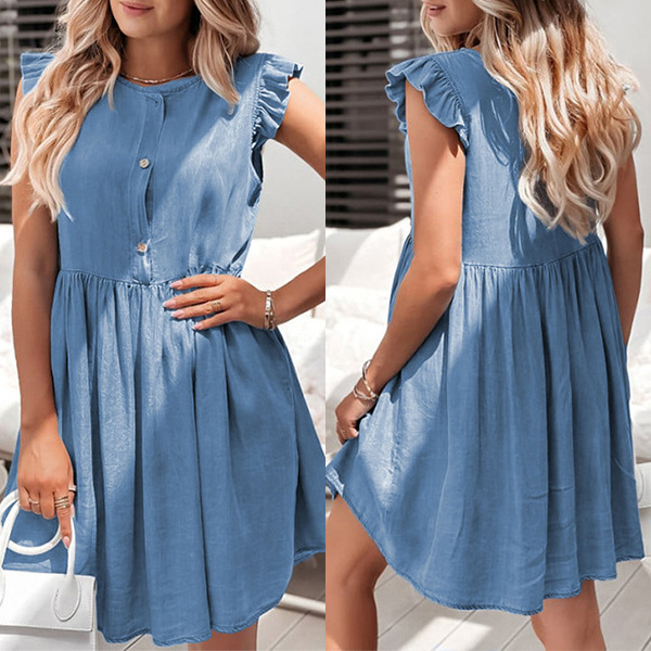 Casual Button Round Neck Ruffle Cap Sleeve Mini Dress