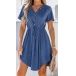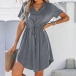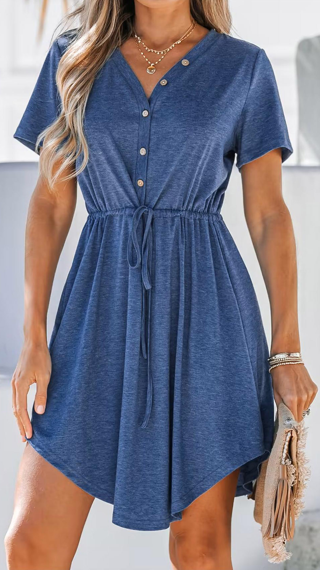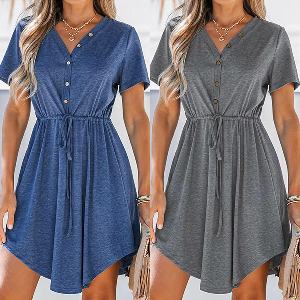 Casual Button V-neck Short Sleeve Cinch Waist Irregular Hemline Mini Dress