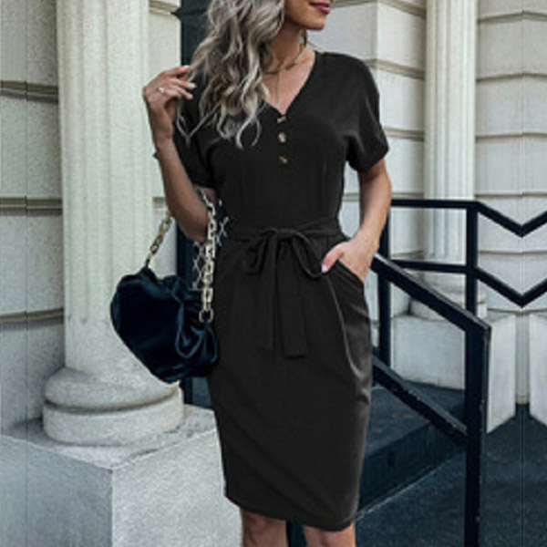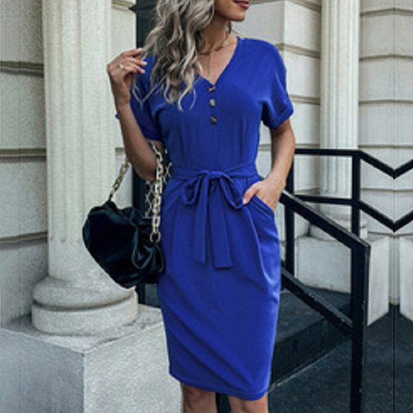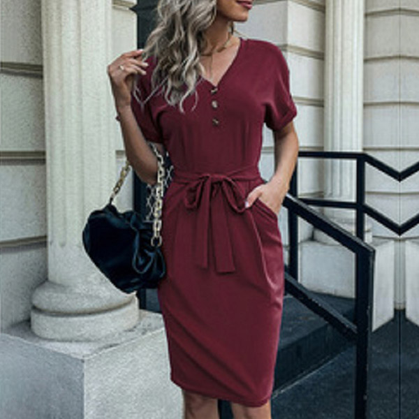 Casual Button V-neck Short Sleeve Self-tie Mini Dress