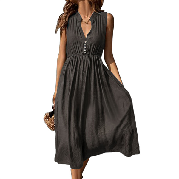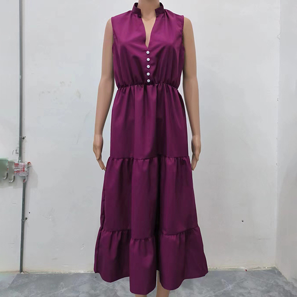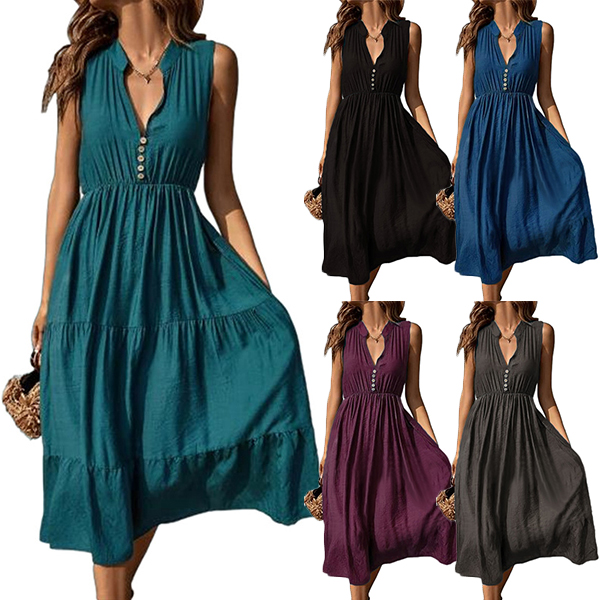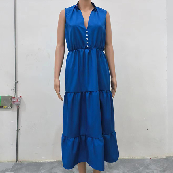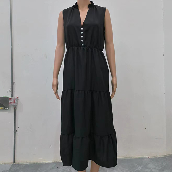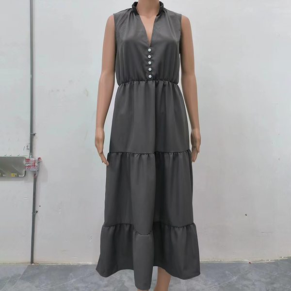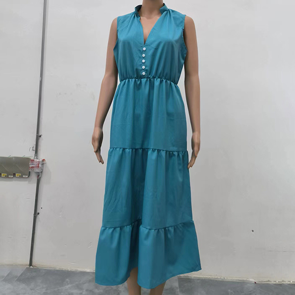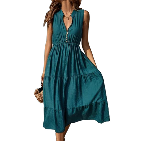 Casual Button V-neck Sleeveless High-rise Tiered Dress
