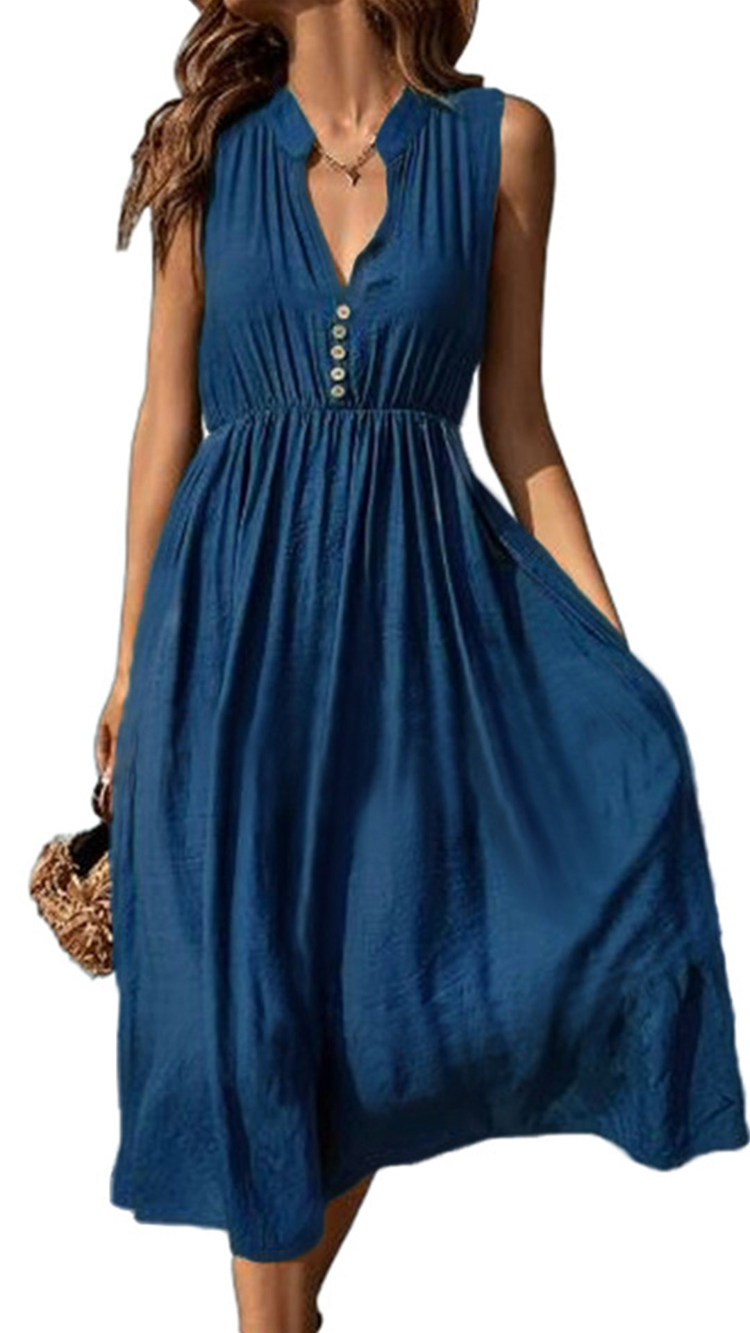 This charming dress features a button-front design, a flattering V-neckline, sleeveless construction, a high-rise waist, and tiered layers, creating a relaxed and fashionable look.