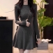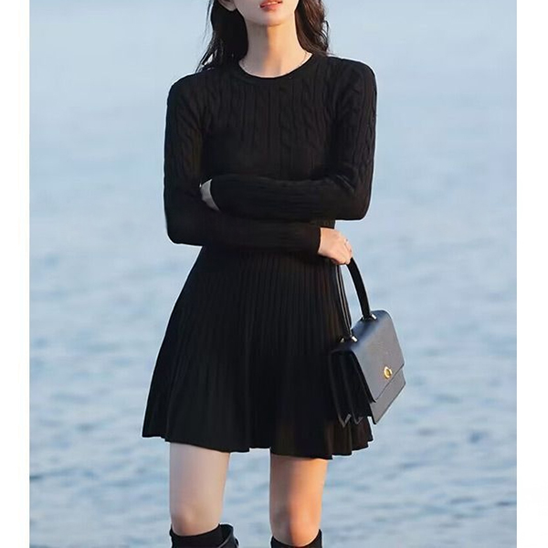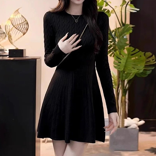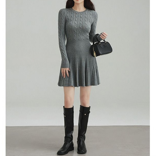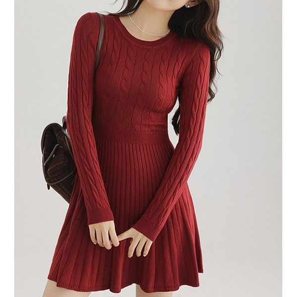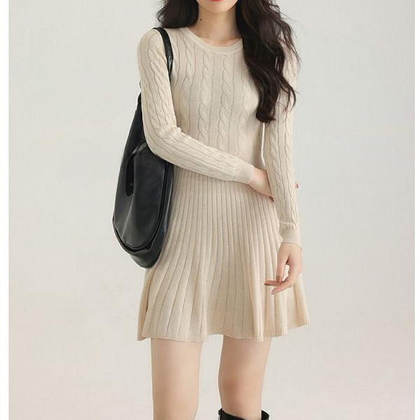 Casual Cable Knitted Crew Neck Long Sleeve High-rise Sweater Dress
