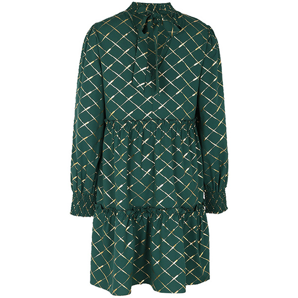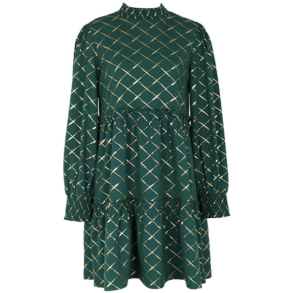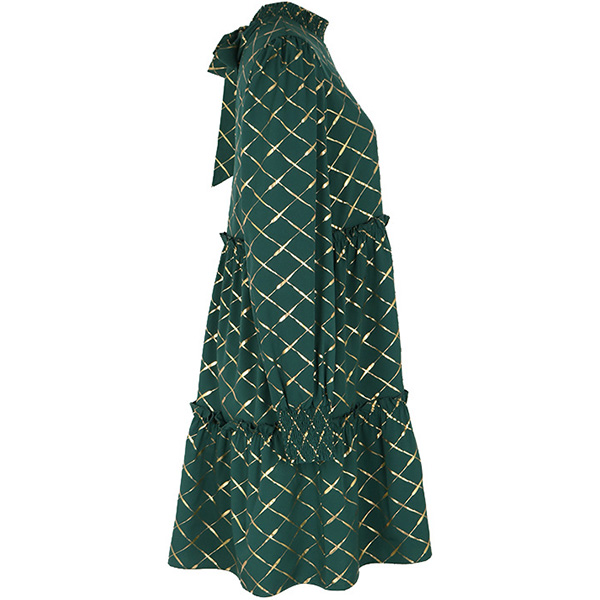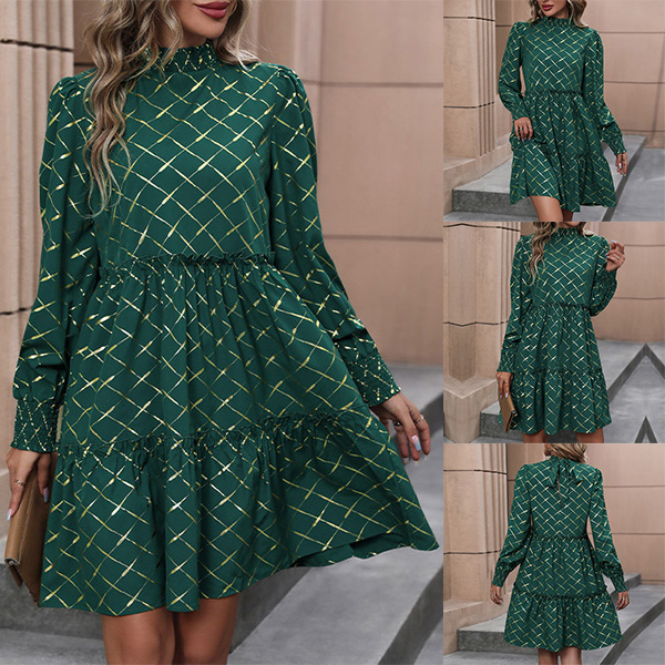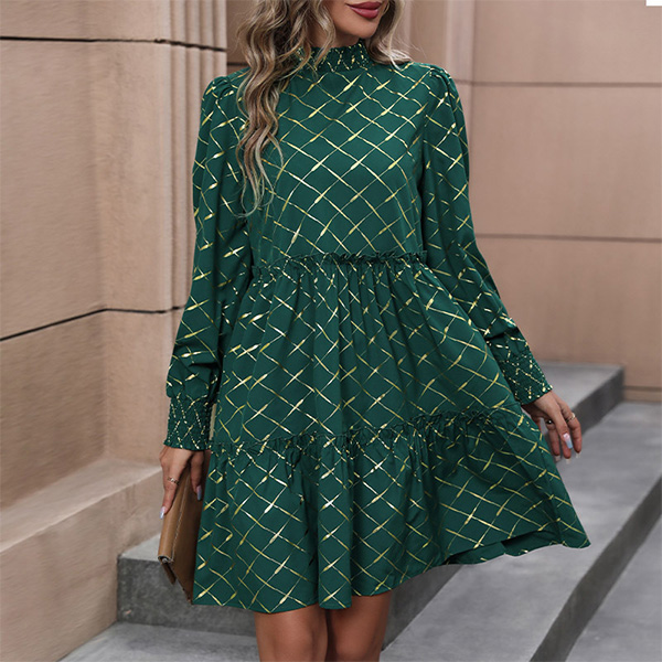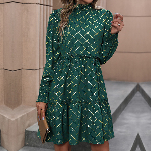 Casual Contrast Color Diamond Pattern Mock Neck Long Sleeve Tiered Dress