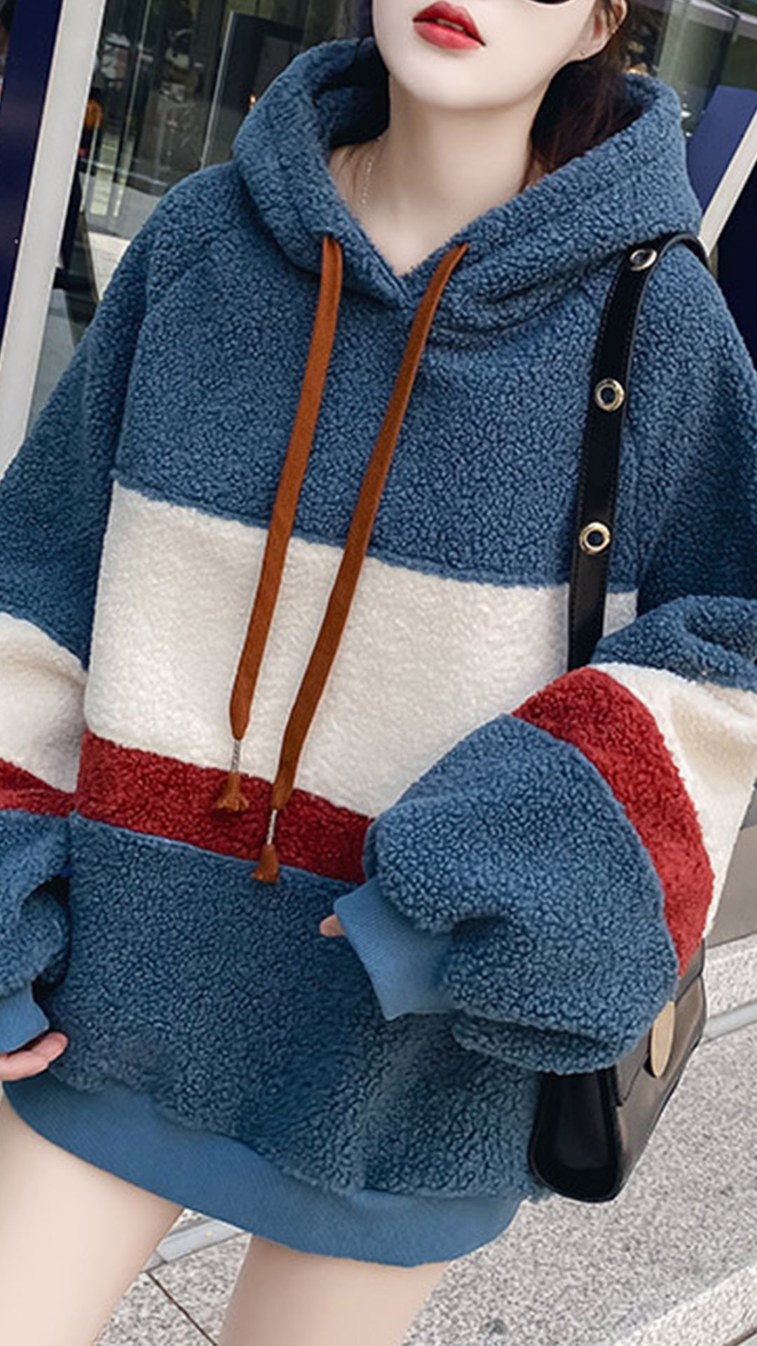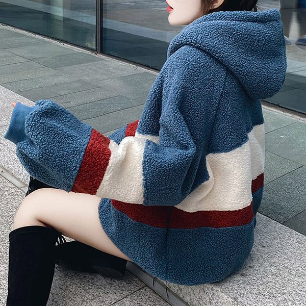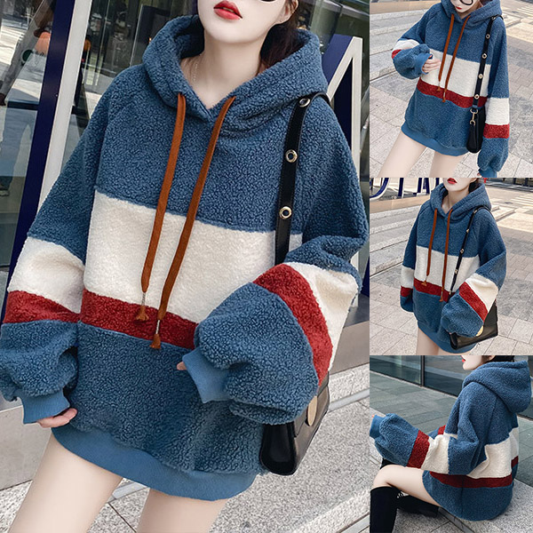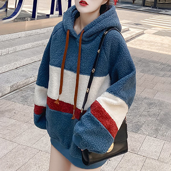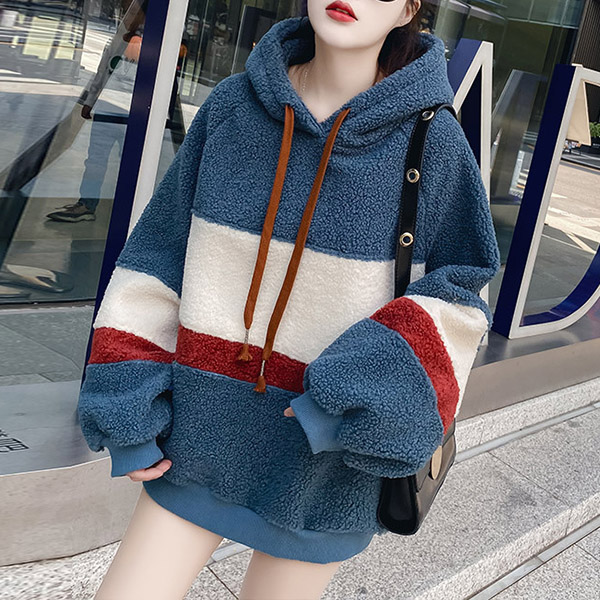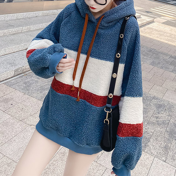 Casual Contrast Color Drawstring Hooded Plush Sweatshirt