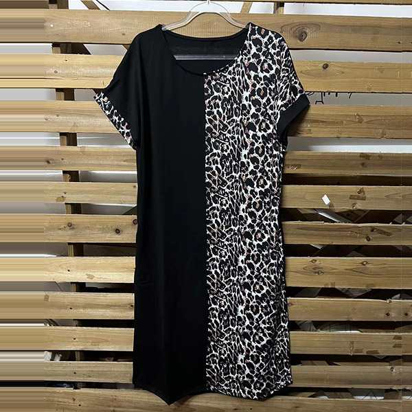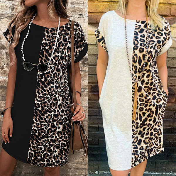 This casual dress features a playful contrast color leopard print design, creating a stylish and fun ensemble perfect for everyday wear.