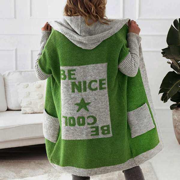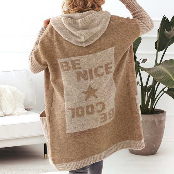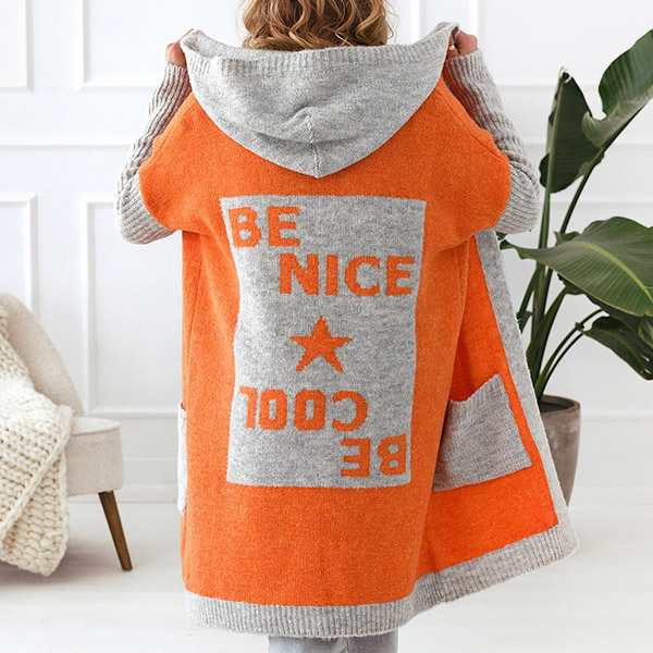 Casual Contrast Color Letter Knitted Hooded Cardigan