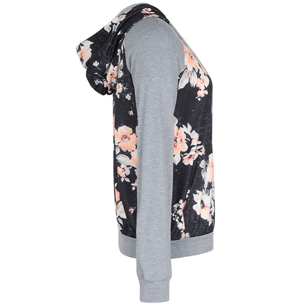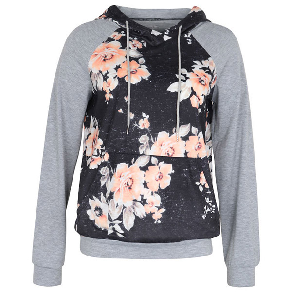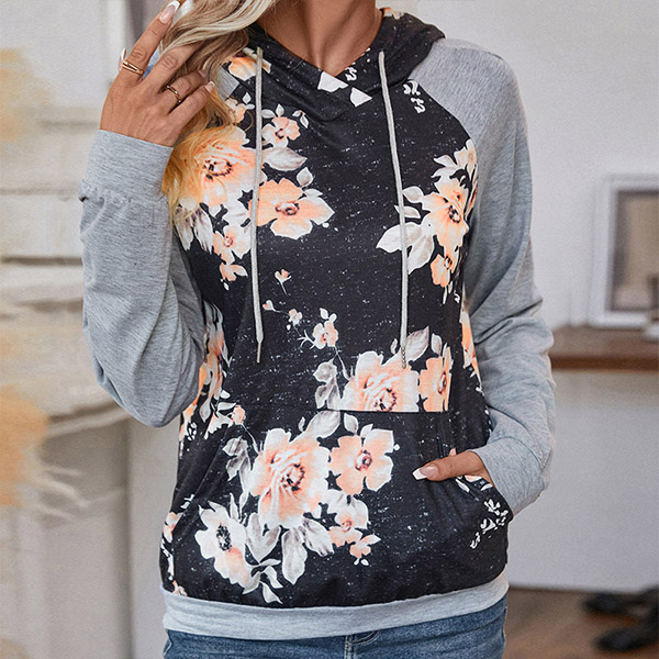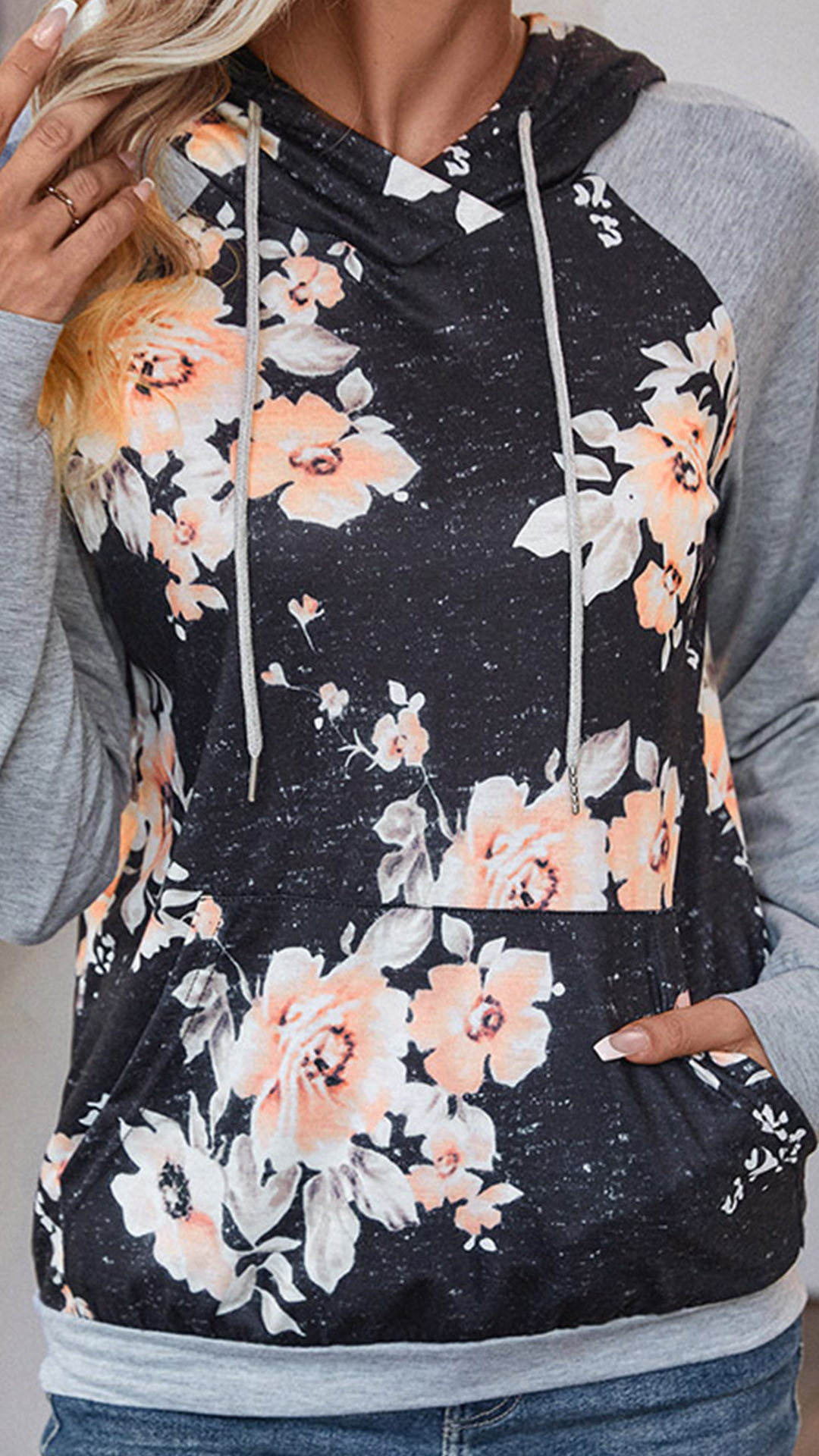 Casual Contrast Color Long Sleeve Floral Print Drawstring Hooded Sweatshirt