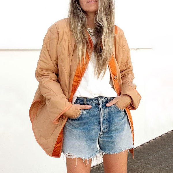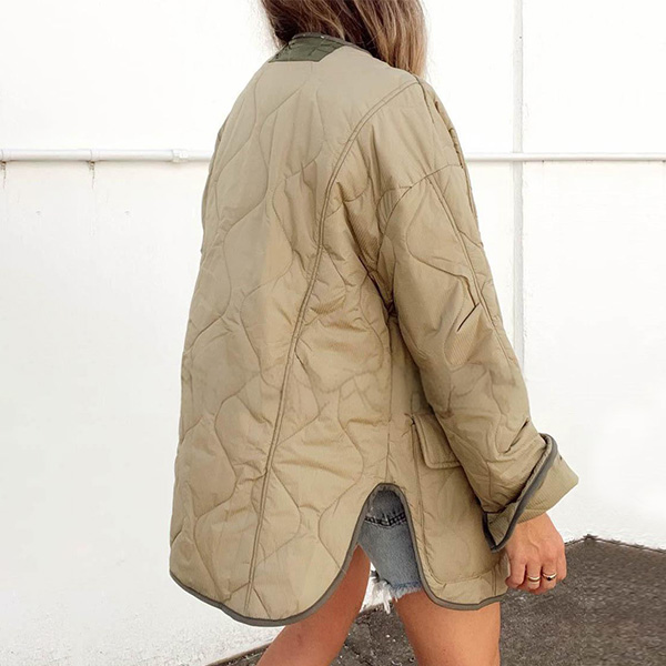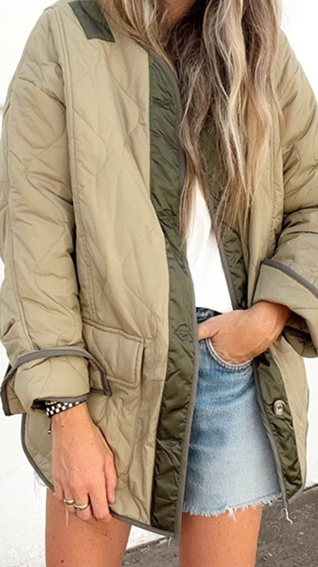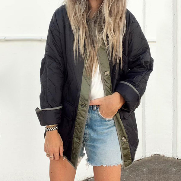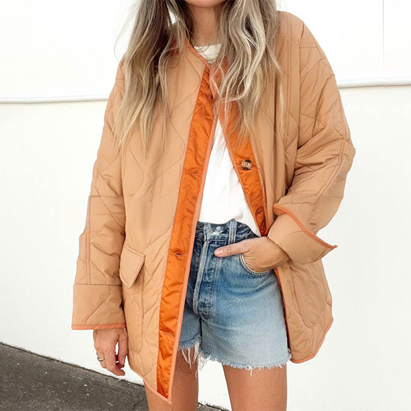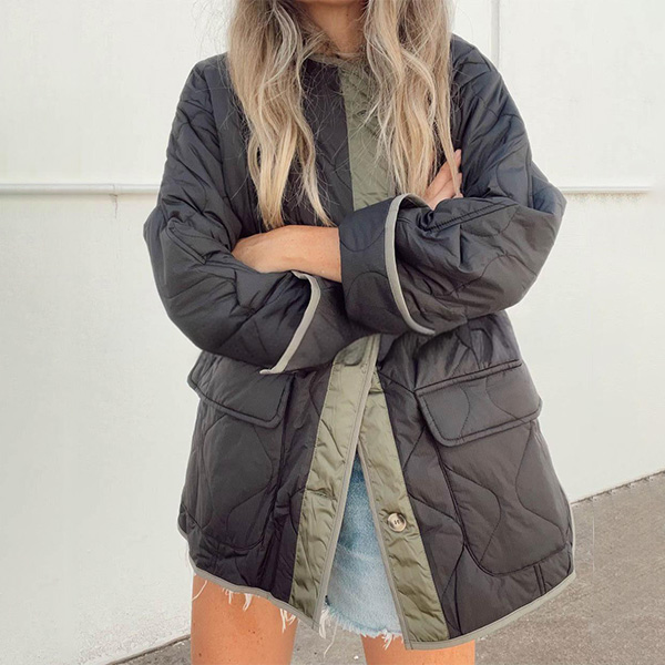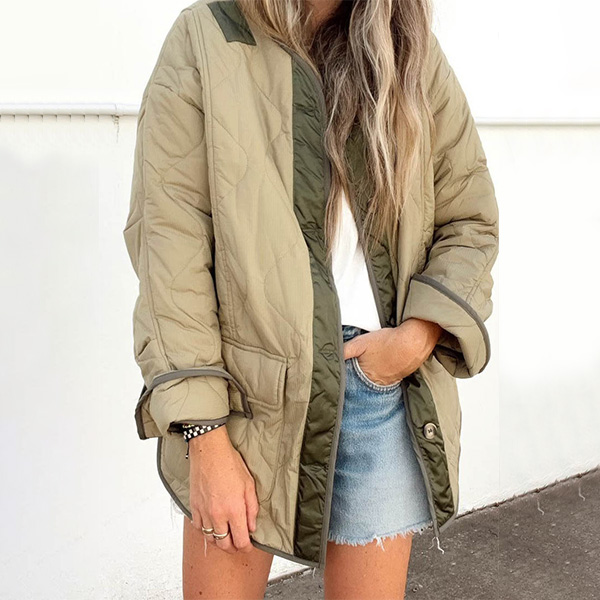 This casual quilted jacket features a contrast color design, long sleeves, and a cozy quilted fabric, creating a stylish and comfortable outerwear option. Pair it with jeans and sneakers for a relaxed and stylish look.