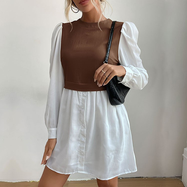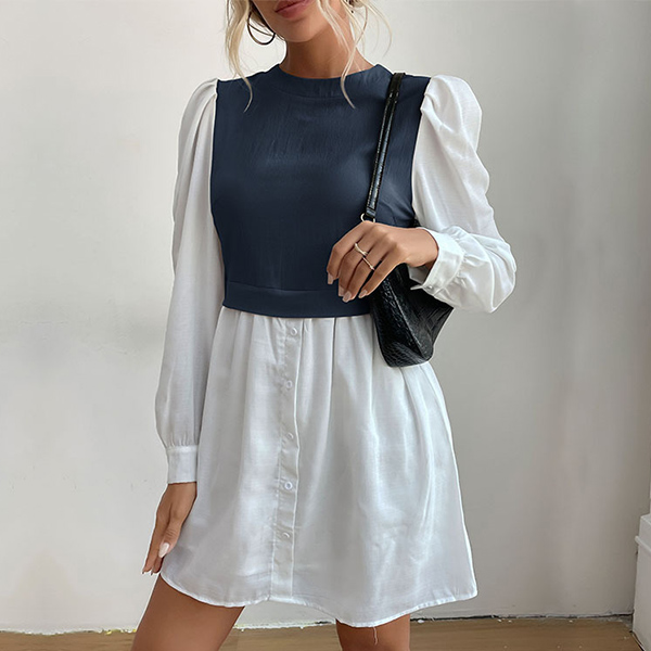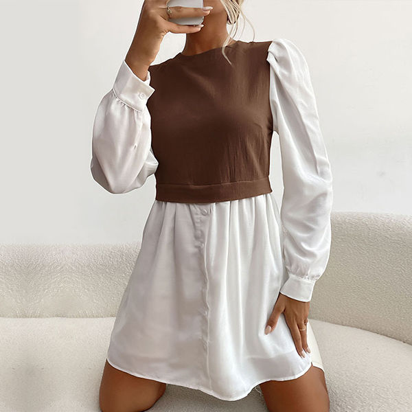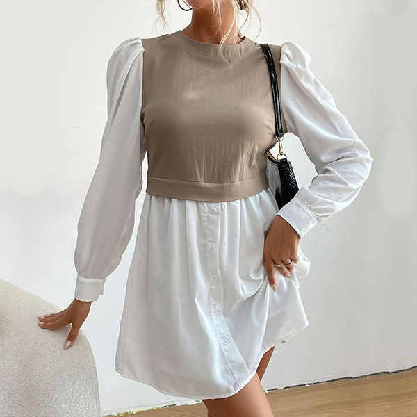 Casual Contrast Color Round Neck Puff Long Sleeve Mock Two-piece Shirt Dress