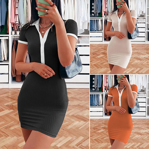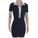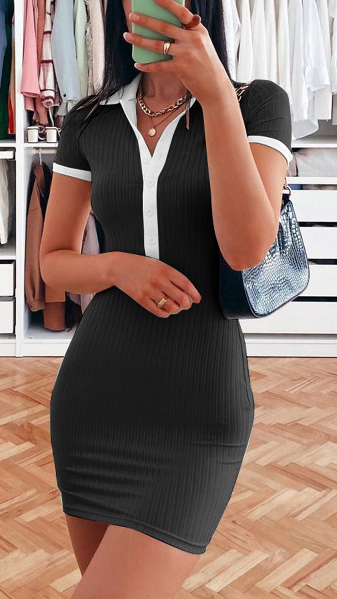 Casual Contrast Color Short Sleeve Polo Neck Buttoned Bodycon Dress