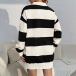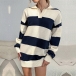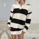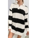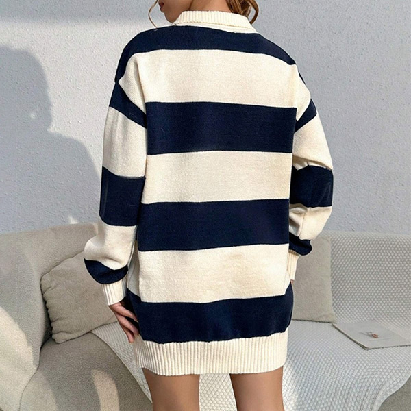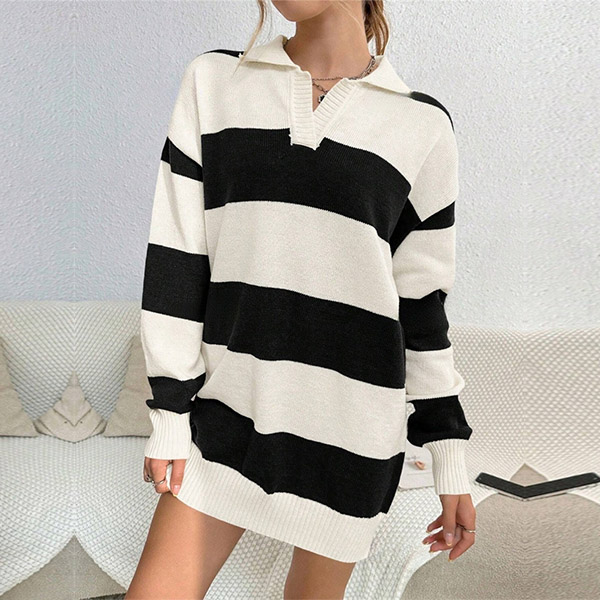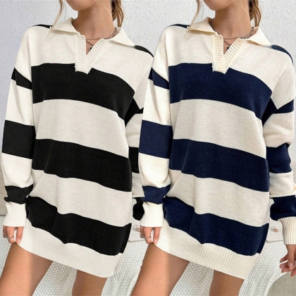 Casual Contrast Color Stripe Lapel V-neck Long Sleeve Sweater Dress