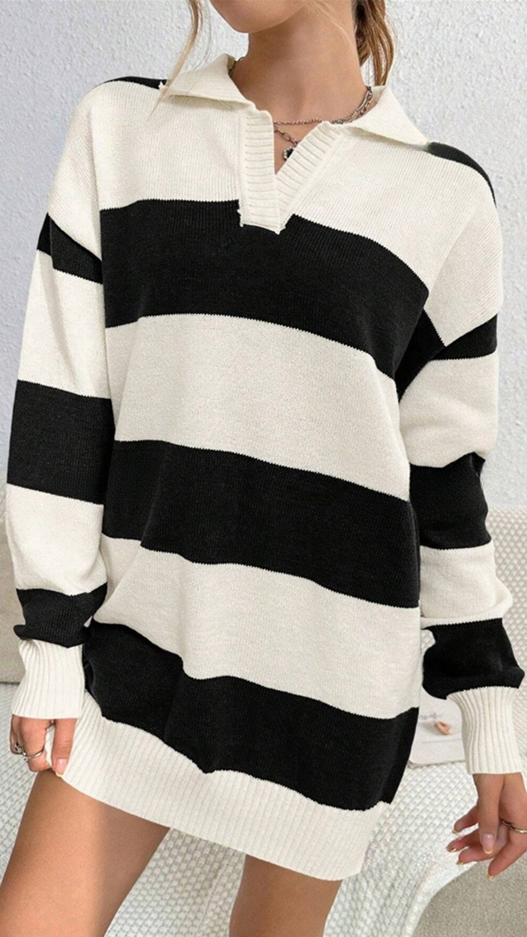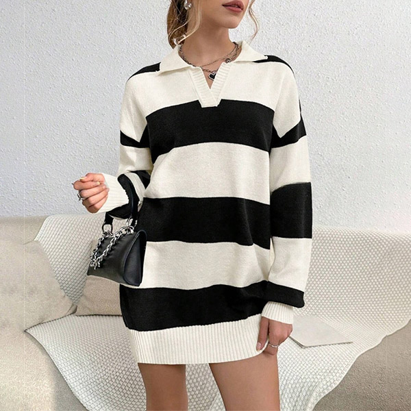 This cozy yet chic dress features a flattering V-neckline and long sleeves, perfect for layering or wearing on its own. The contrast color stripes add a playful touch, while the lapel collar elevates the overall look. It is ideal for casual outings or weekend brunches!