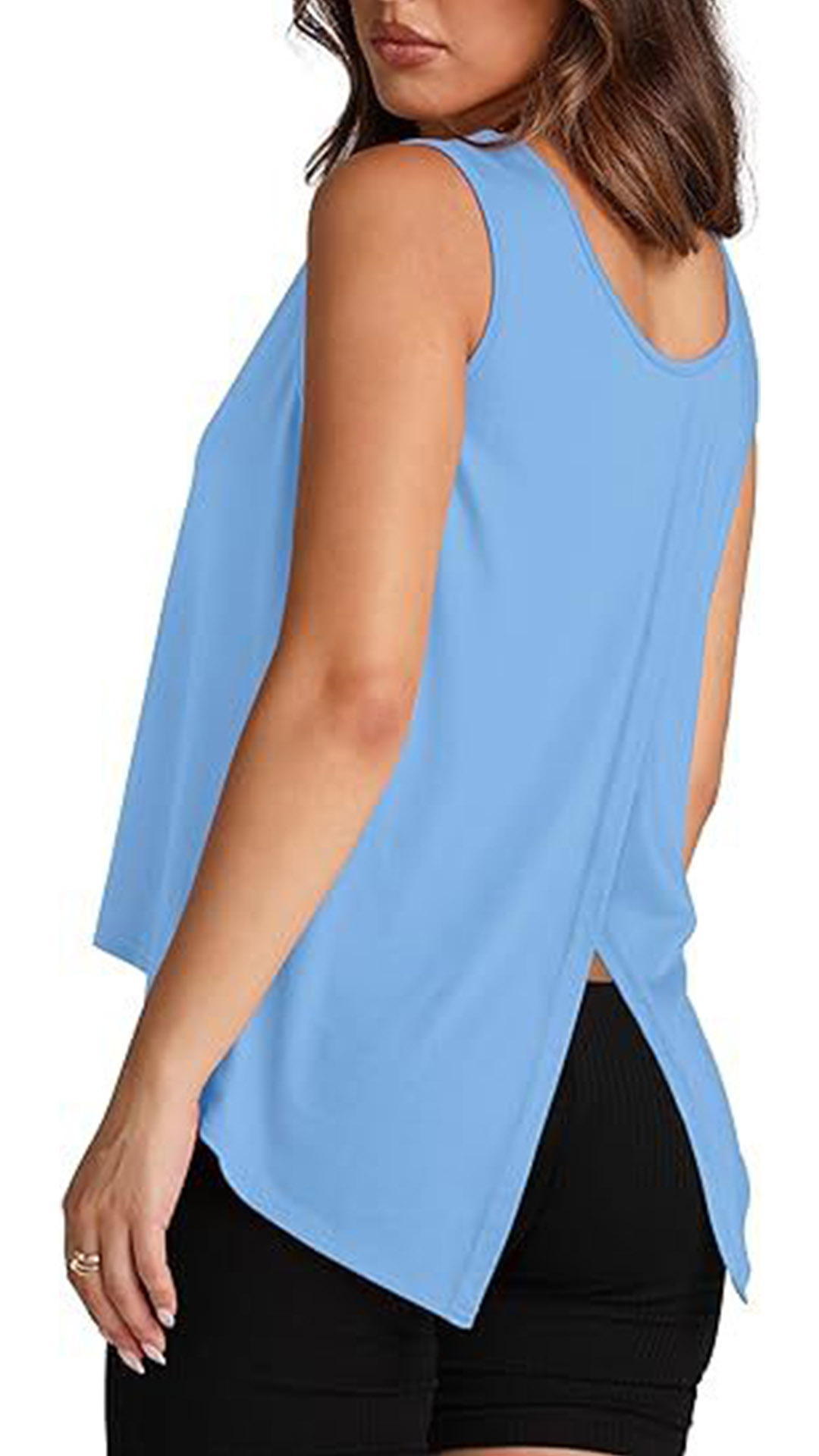 Look at this sleeveless tank top! The back slit detail adds a unique and modern touch to the tank top, giving it an edgy and fashion-forward vibe. This tank top is perfect for a casual day out or a laid-back weekend look.