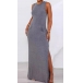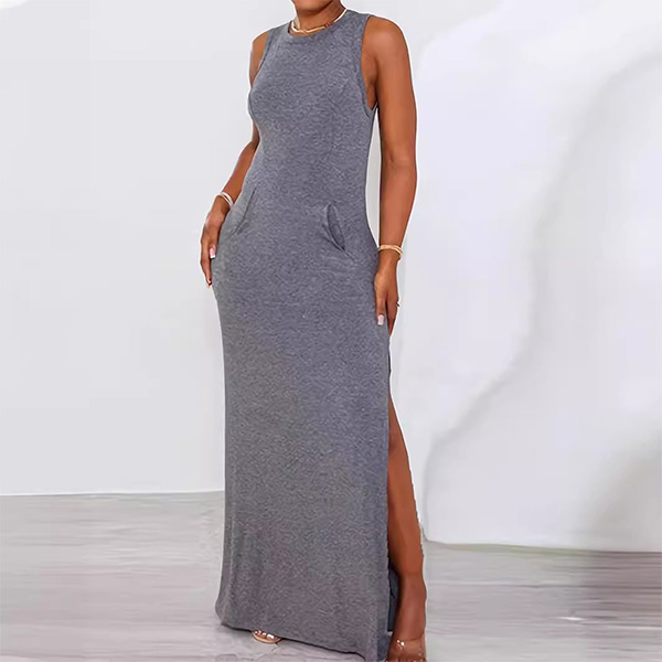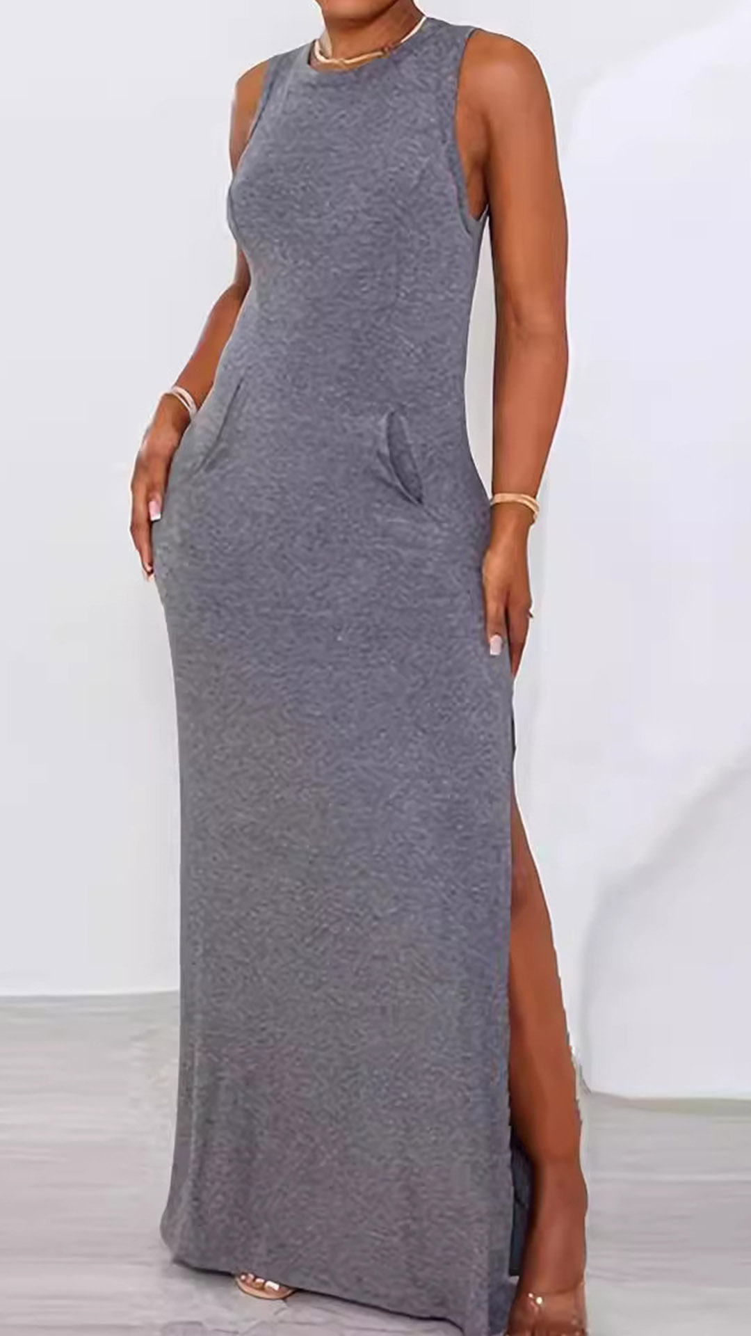 This gray dress features a crew neckline, sleeveless silhouette, patch kangaroo pockets and a long, flowing skirt with slit details, this maxi dress offers effortless elegance that can be dressed up or down for any occasion.
