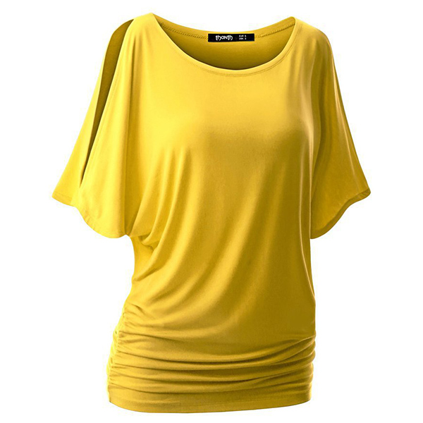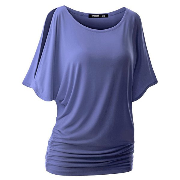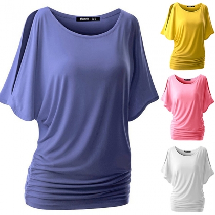 This casual shirt features a classic crew neck and short sleeves with a stylish slit detail and ruched hemline design that adds a touch of interest and texture. Perfect for everyday wear.