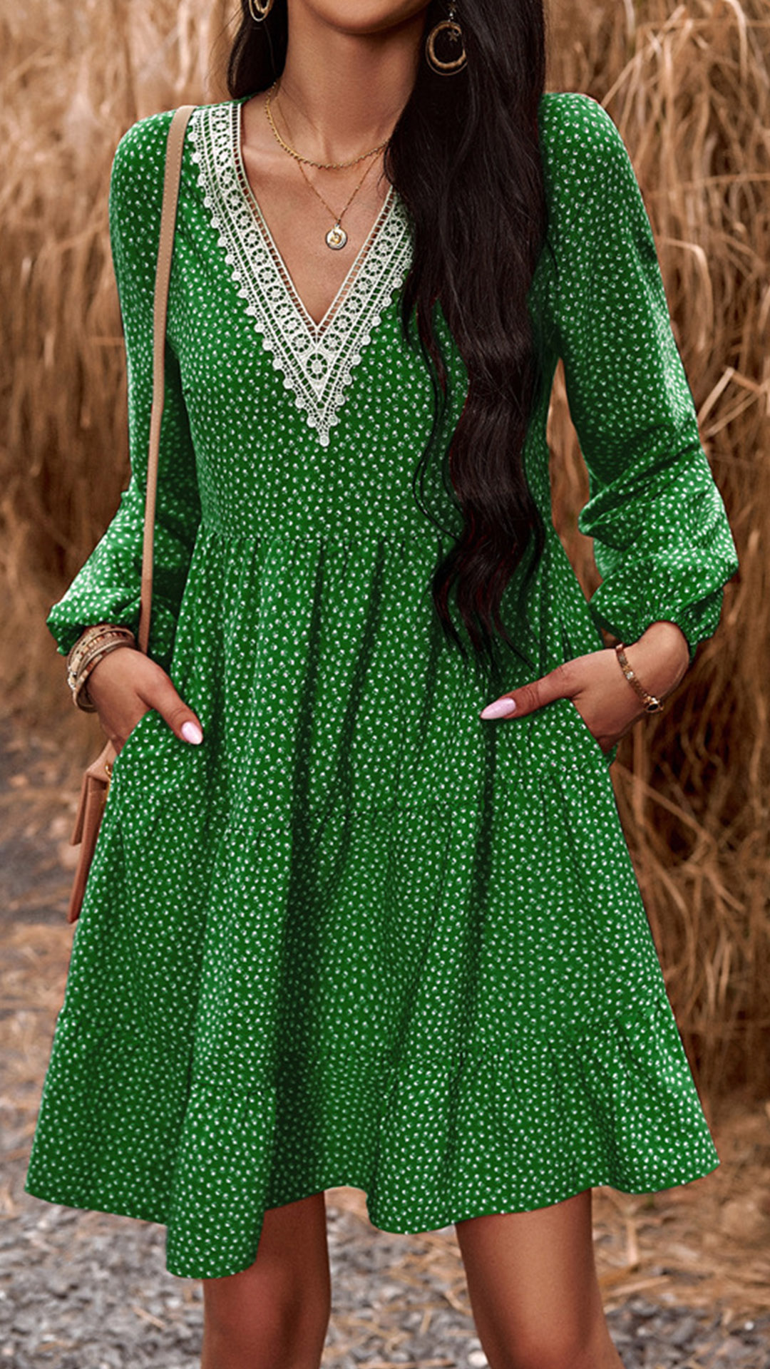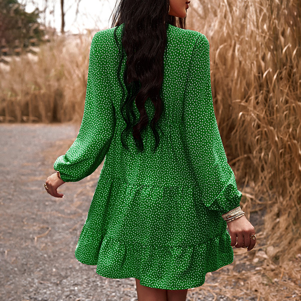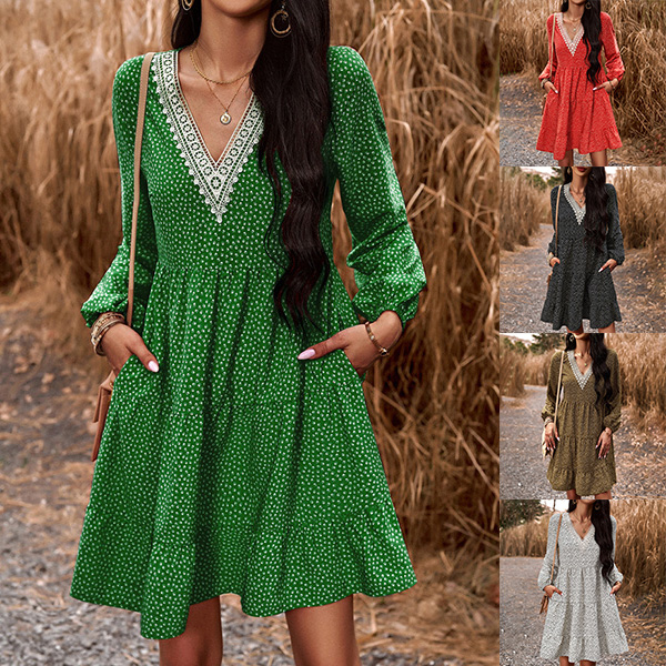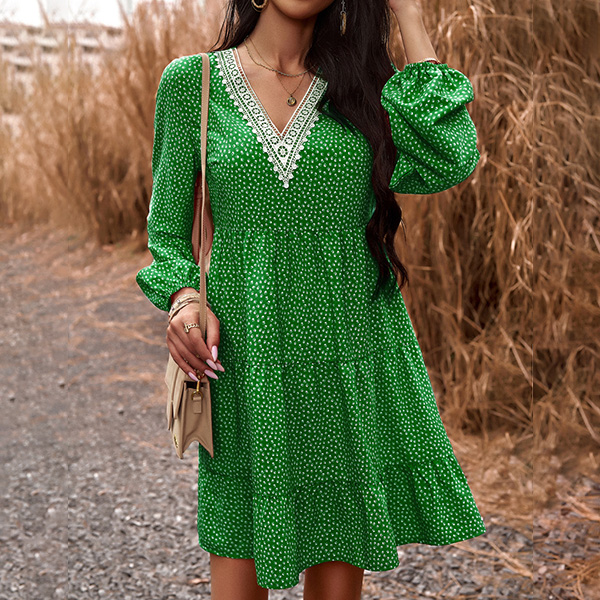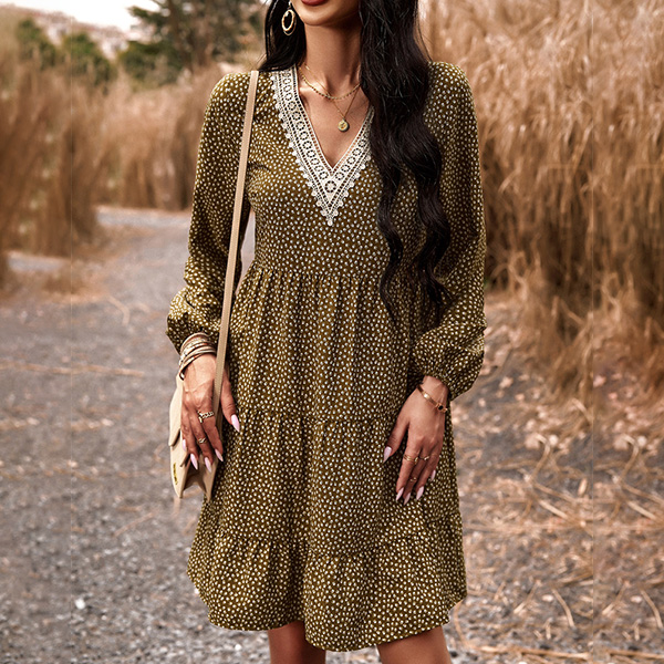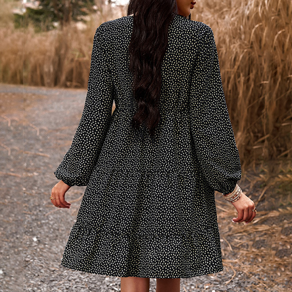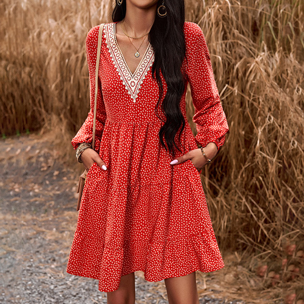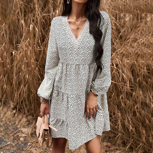This dress effortlessly combines a casual and playful vibe with a touch of elegance. The dot print adds a whimsical and youthful charm, while the contrast color V-neck detailing brings a modern twist to the design. Wanna have a try?