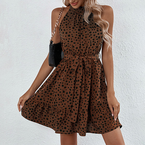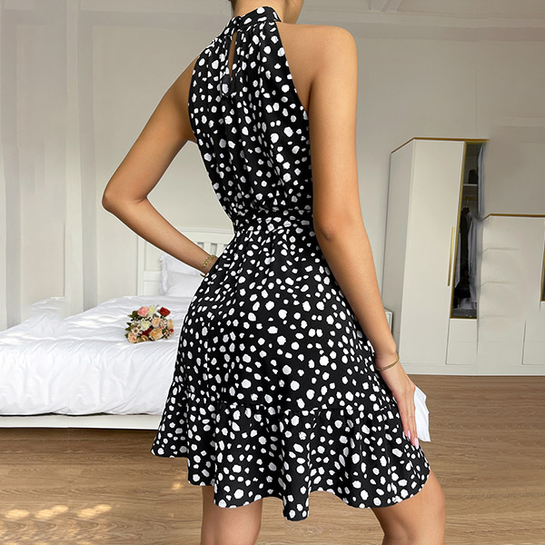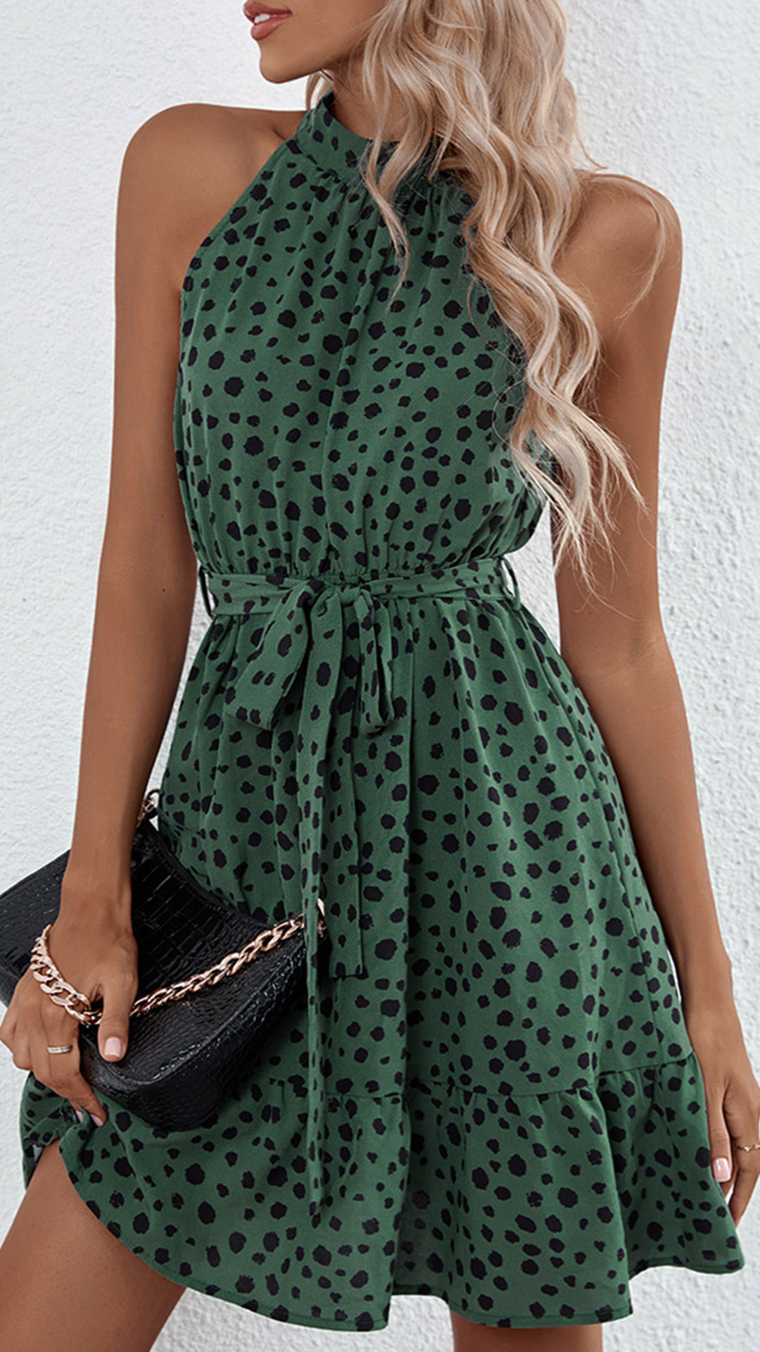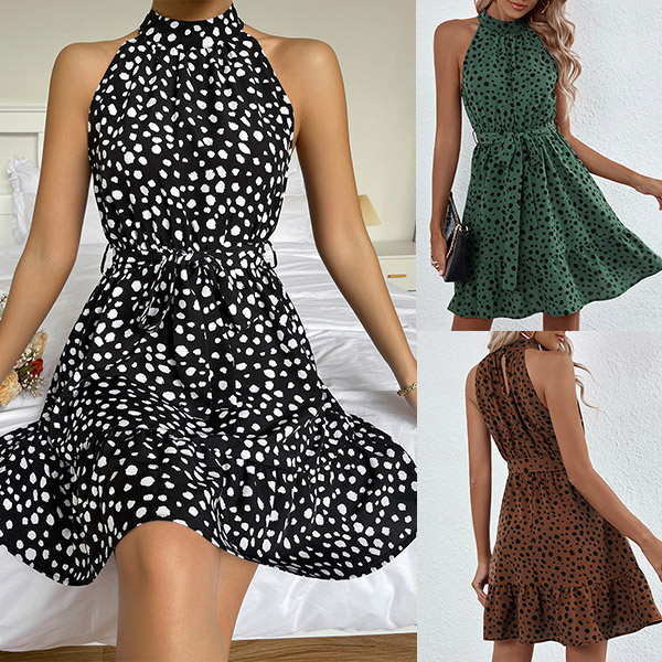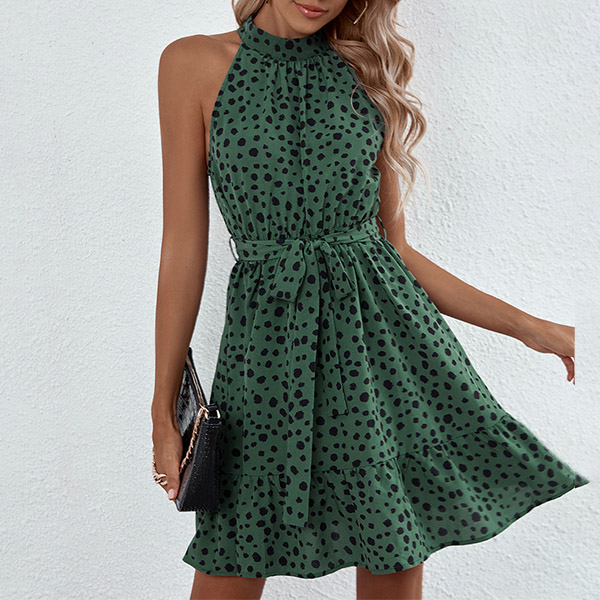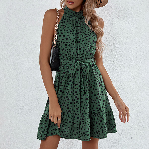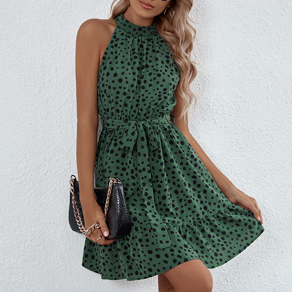 Casual dress in color green and features the dot printed. Sleeveless, tie-belt, ruffle hemline, add with a sandals for casual summer look.