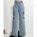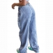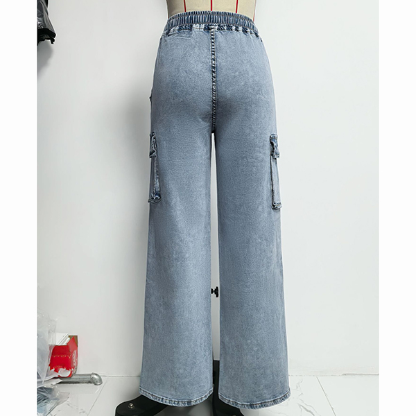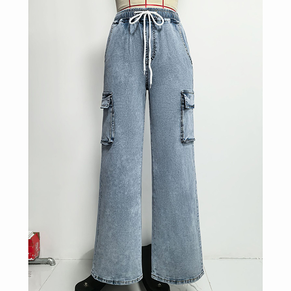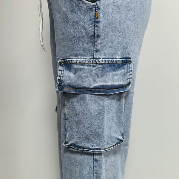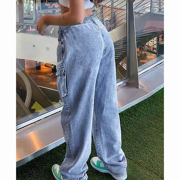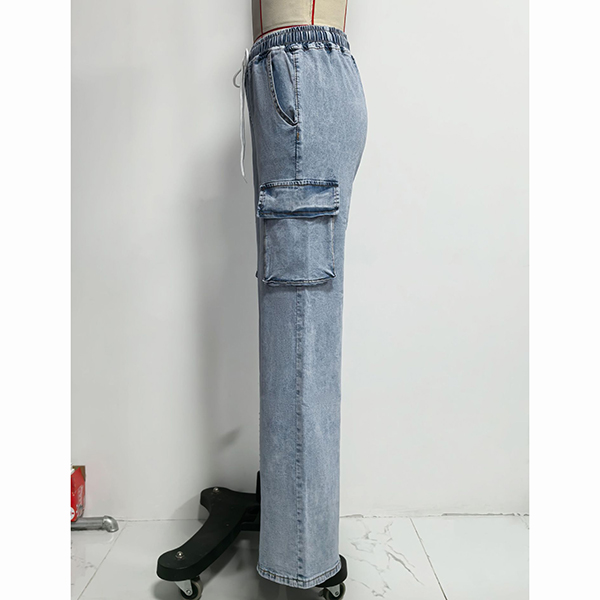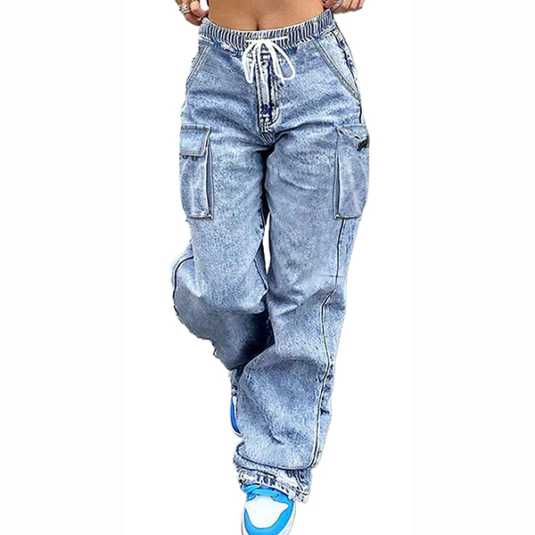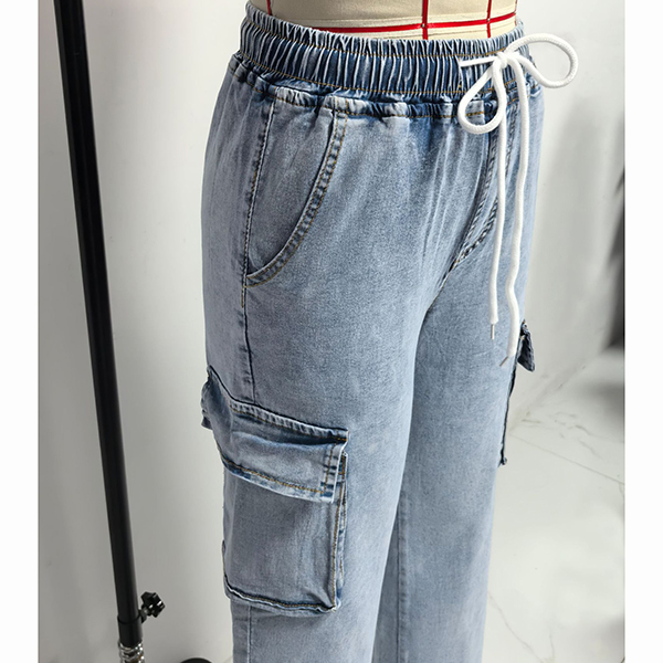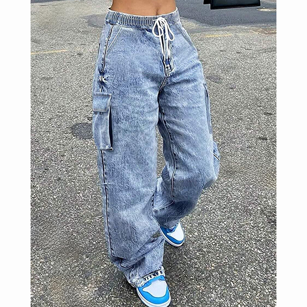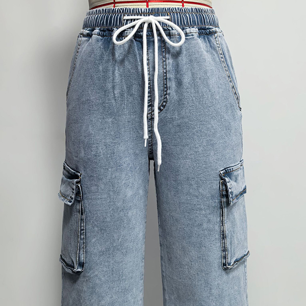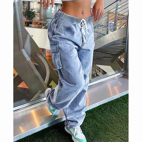 Casual Drawstring Elastic Waist Side Patch Pockets Loose Denim Jeans