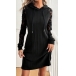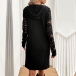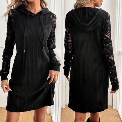 Casual Drawstring Hooded Lace Spliced Long Sleeve Ribbed Dress