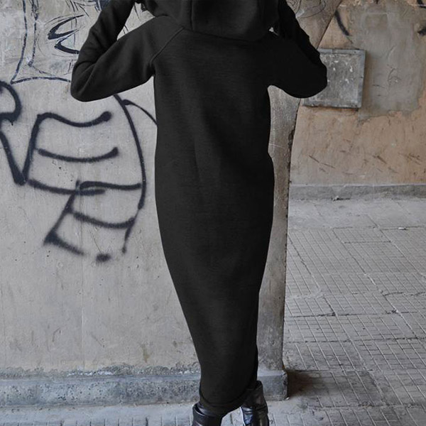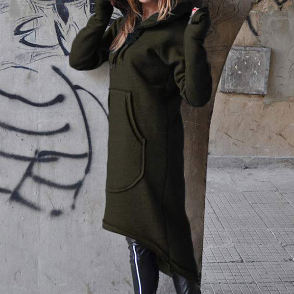 This dress features a drawstring hood for a sporty touch, long sleeves for added coverage, and kangaroo pockets for a practical and laid-back vibe. It is perfect for casual days or lounging at home.
