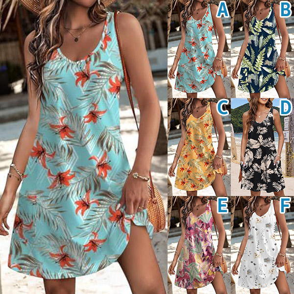 This is a charming and versatile dress that combines a round neckline, sleeveless design, and a vibrant floral print for a casual and feminine look.