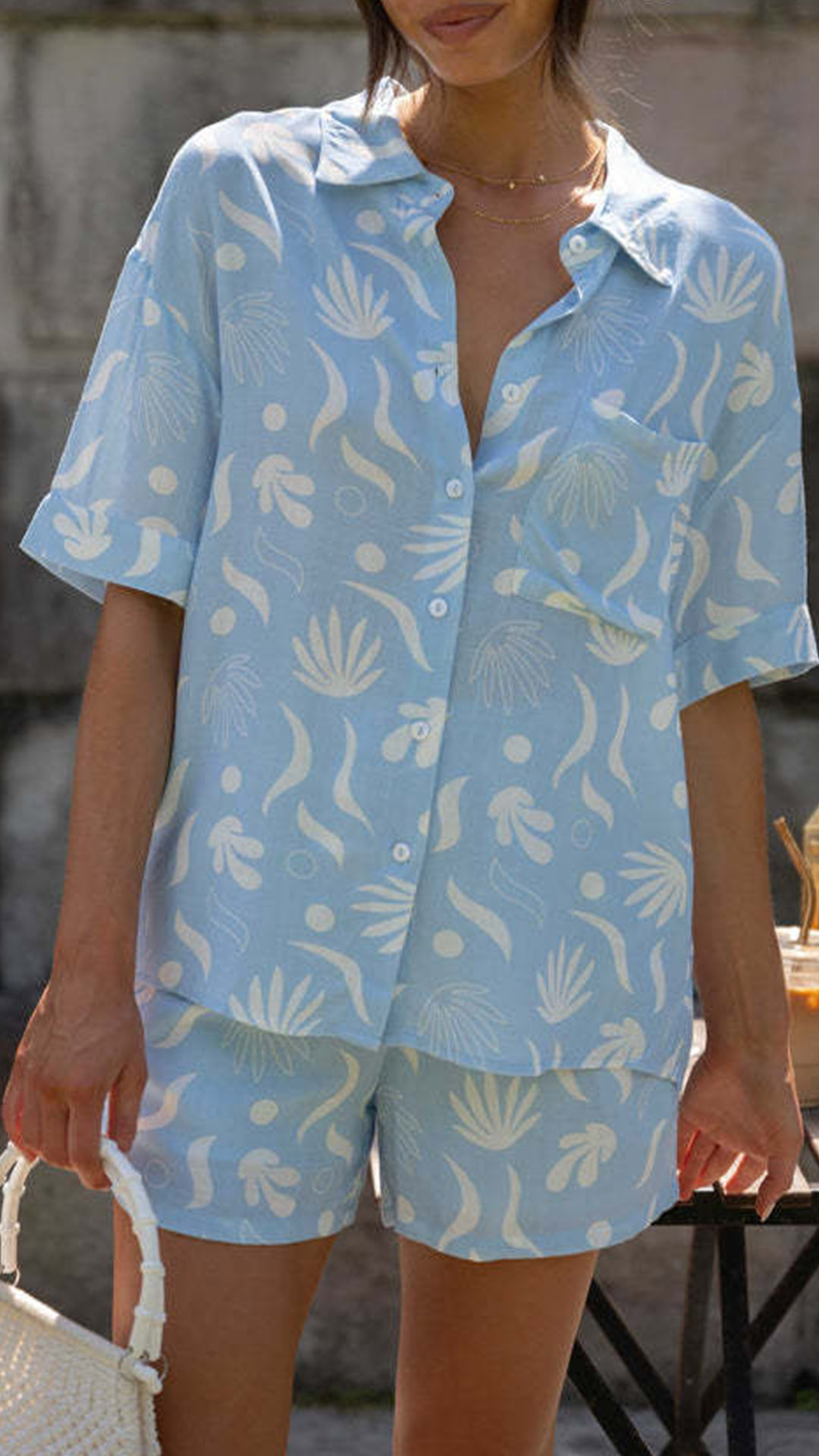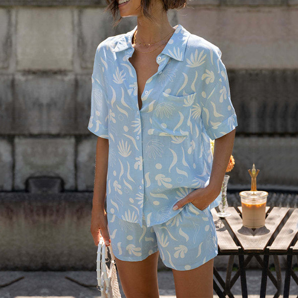 Casual Floral Printed Two-piece Set Consist of Blouse and Shorts