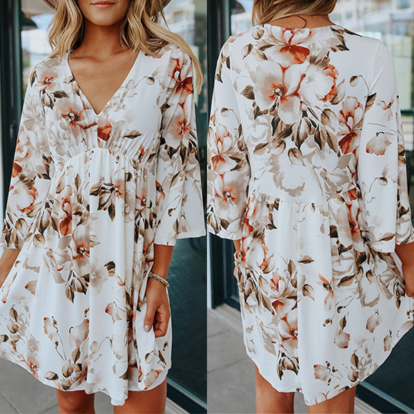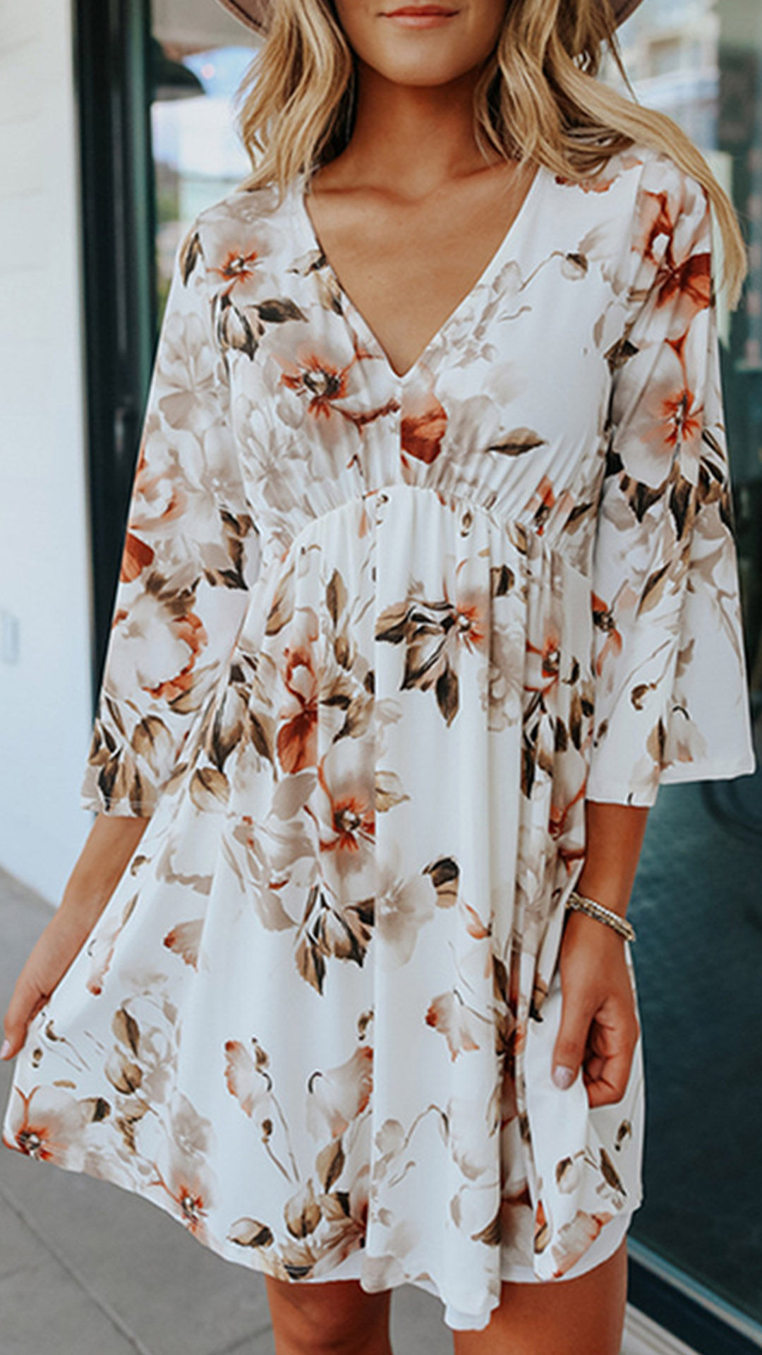 Casual Floral Printed V-neck Elbow Sleeve Mini Dress