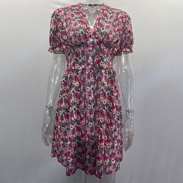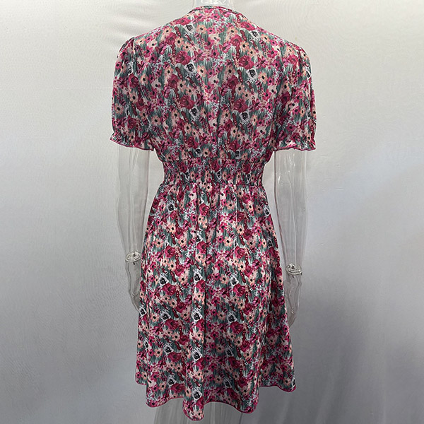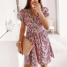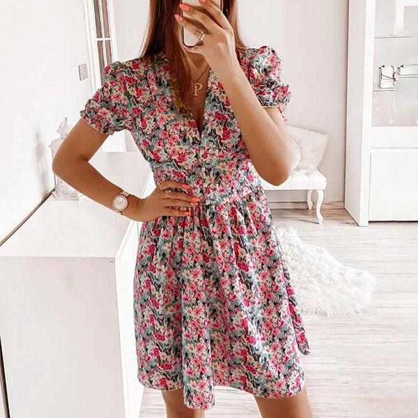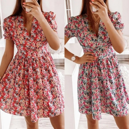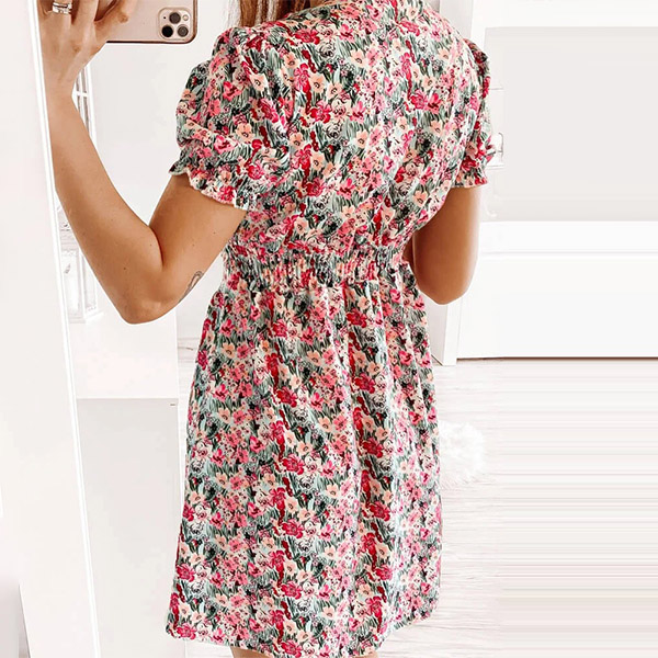 Casual Floral Printed V-neck Peasant Sleeve Mini Dress