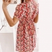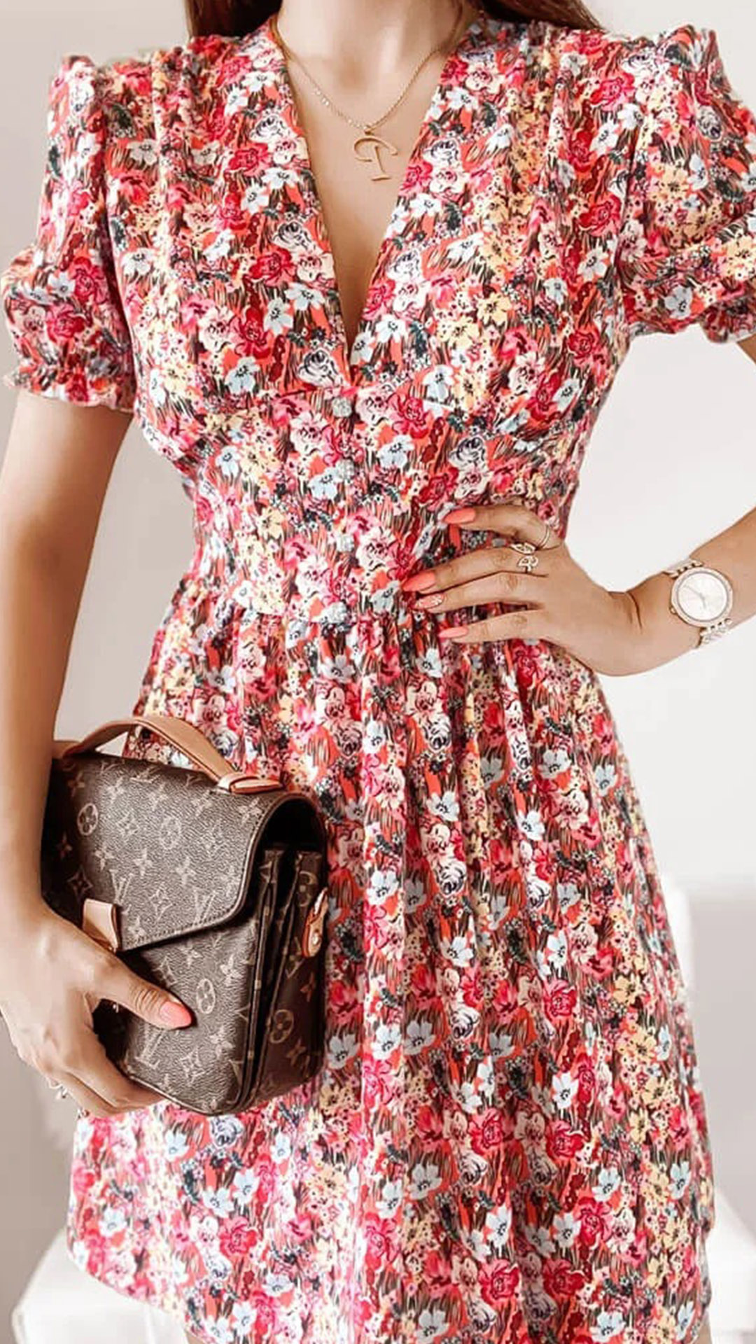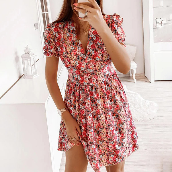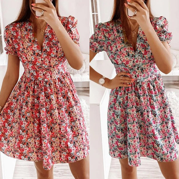 This is a casual, floral printed mini dress with a v-neck and peasant sleeves. It is perfect for a day out or a casual event.