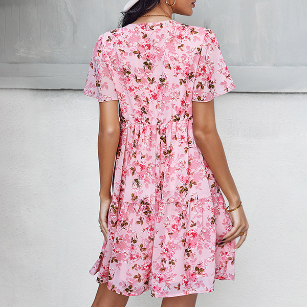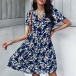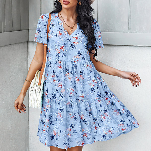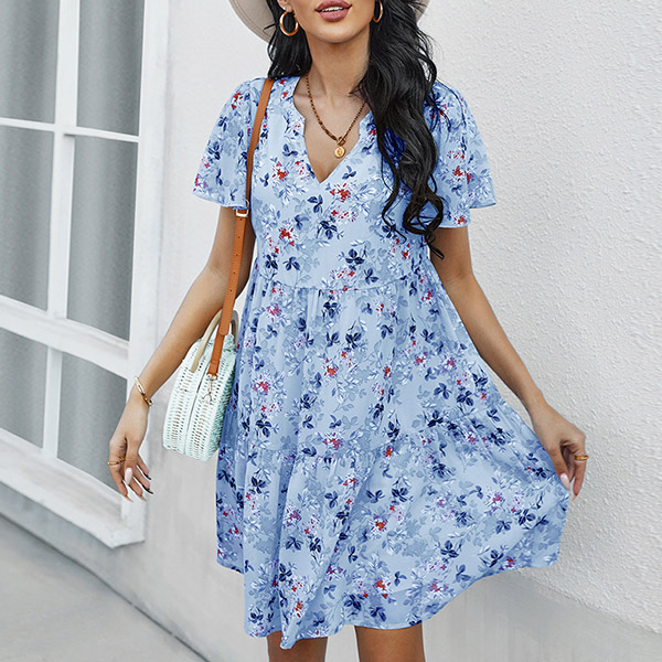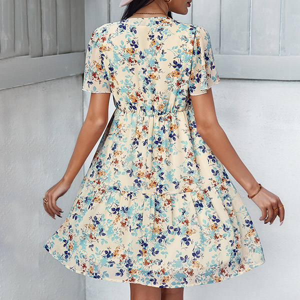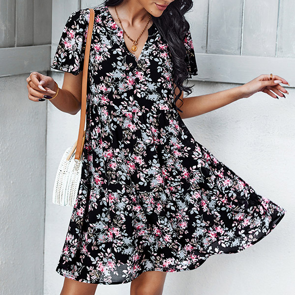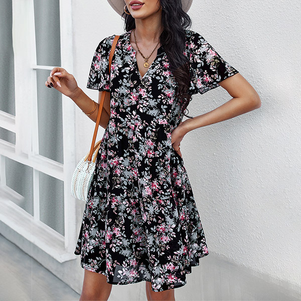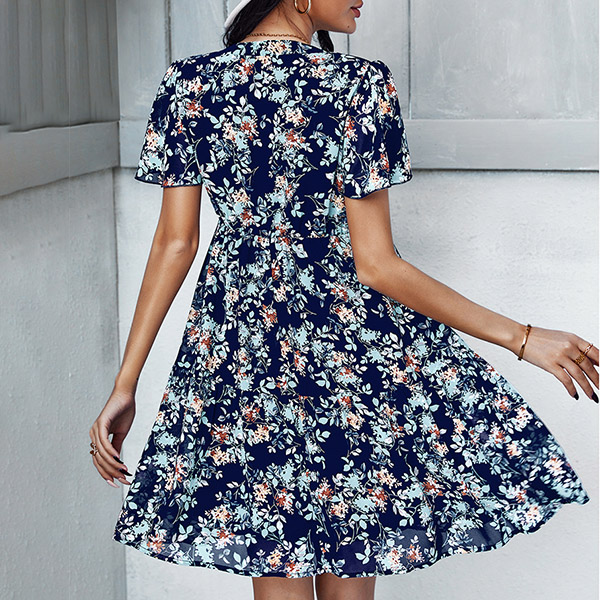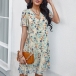 Casual Floral Printed V-neck Short Sleeve Mini Dress