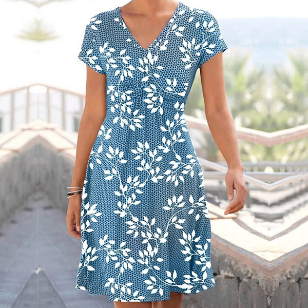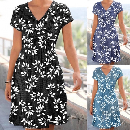 Casual Floral Printed V-neck Short Sleeve Summer Dress