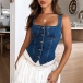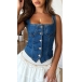 Casual Front Button Square Neck Old-washed Denim Sleeveless Shirt