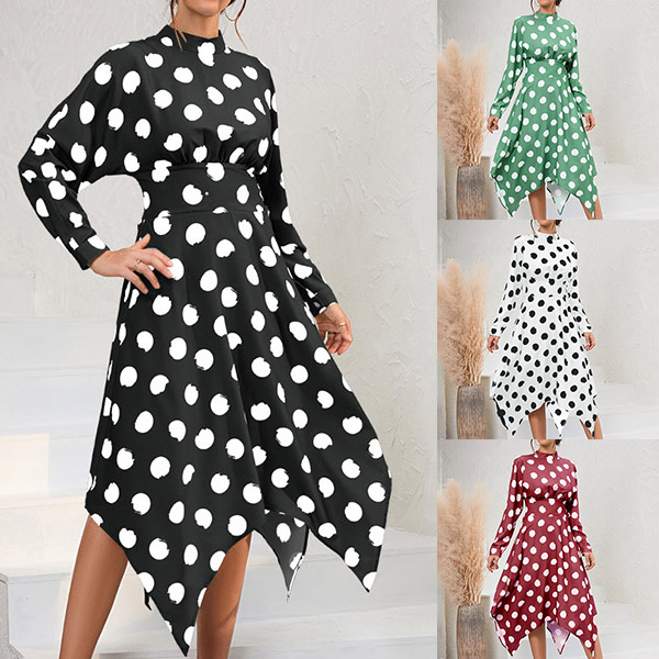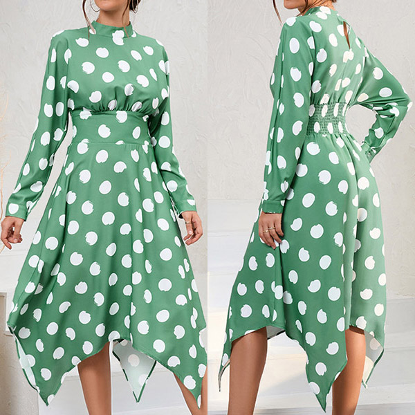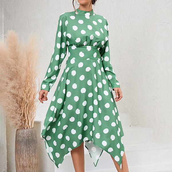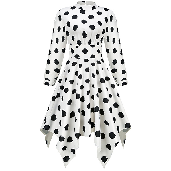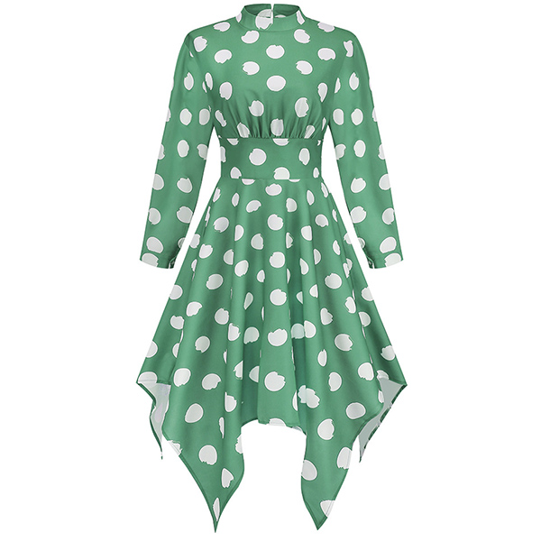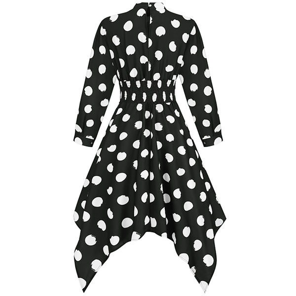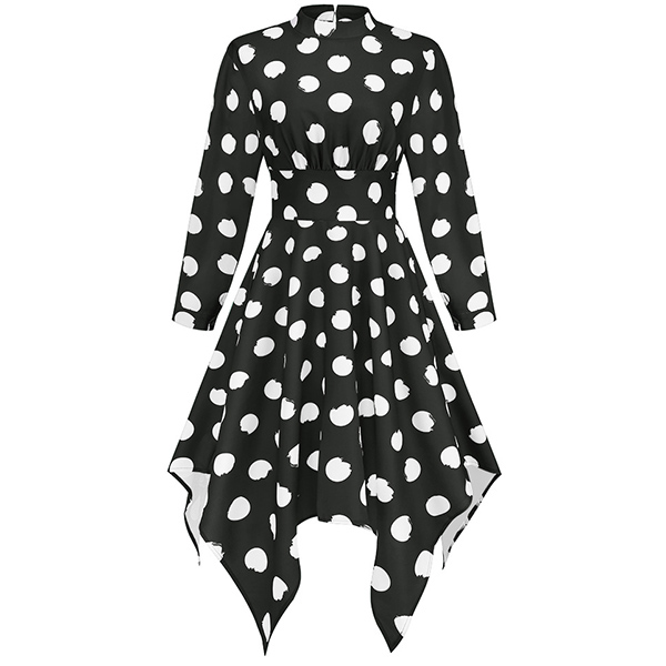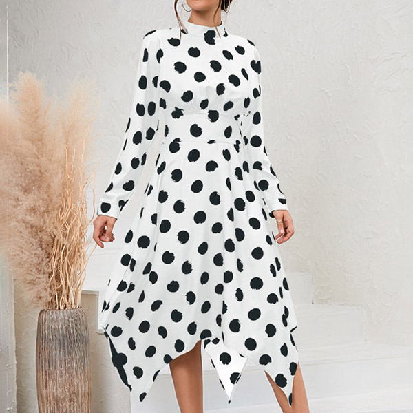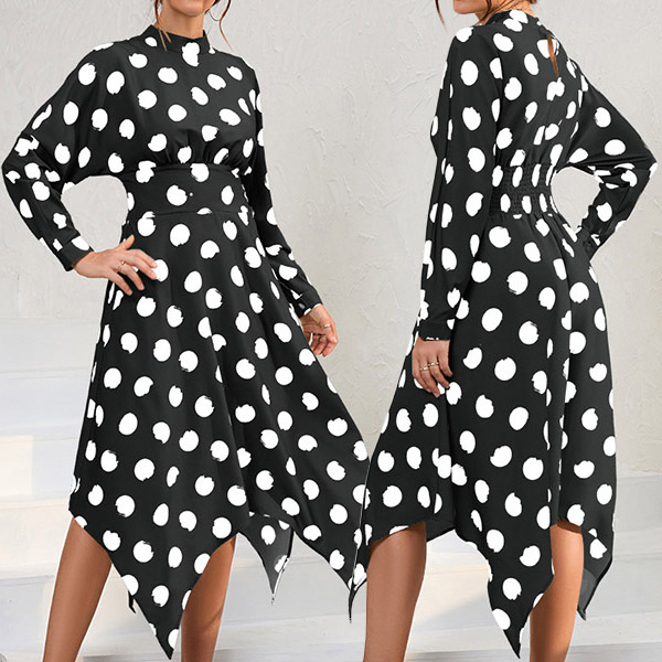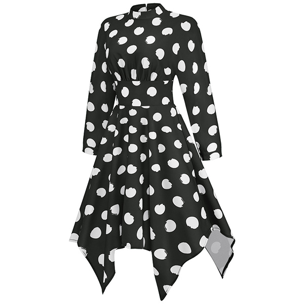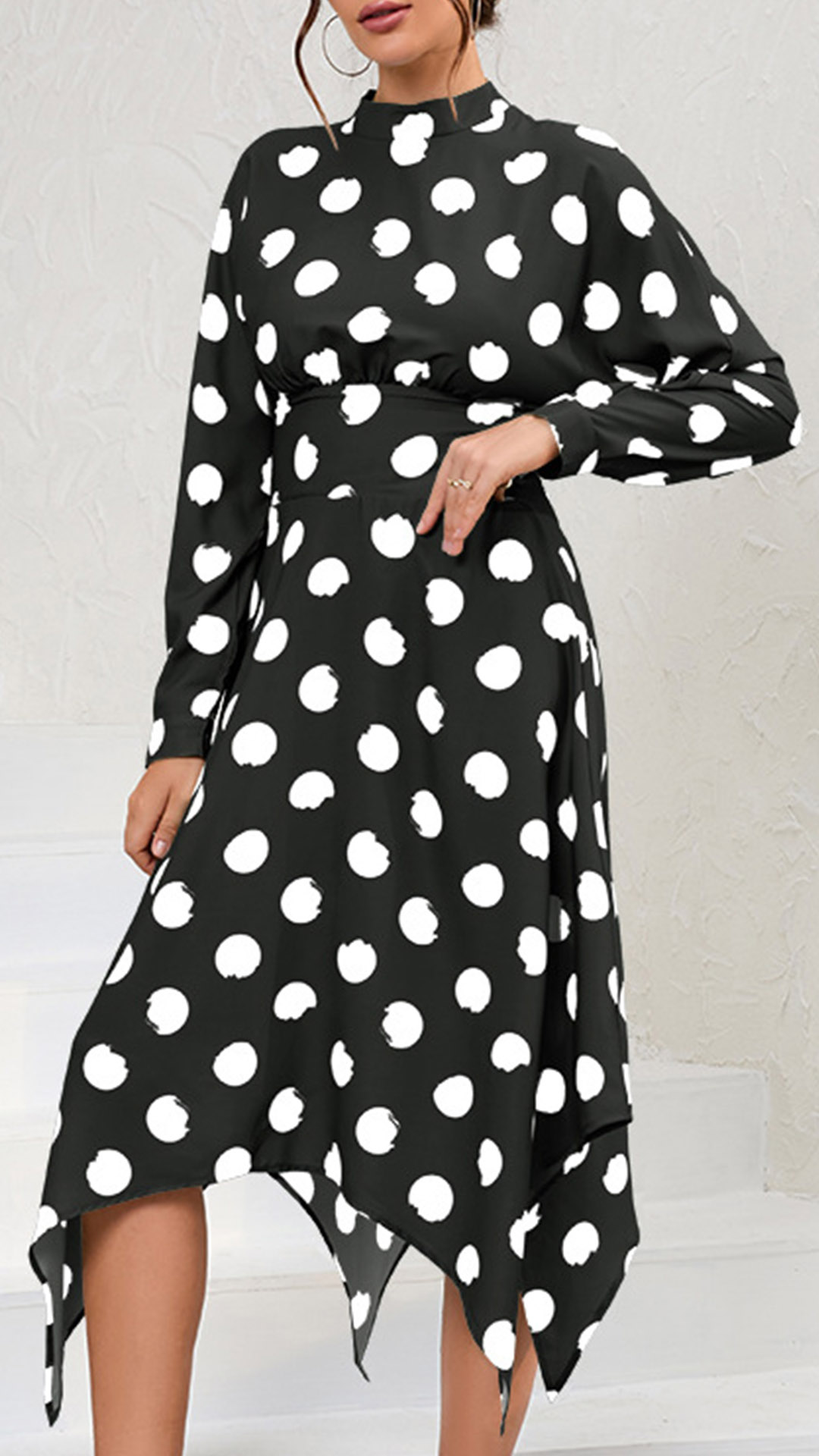 Casual Irrgular Polka-dot Printed Mock Neck Long Sleeve Irregular Hemline Dress