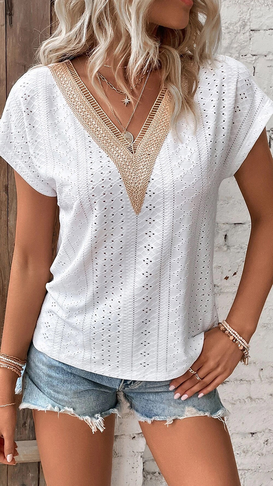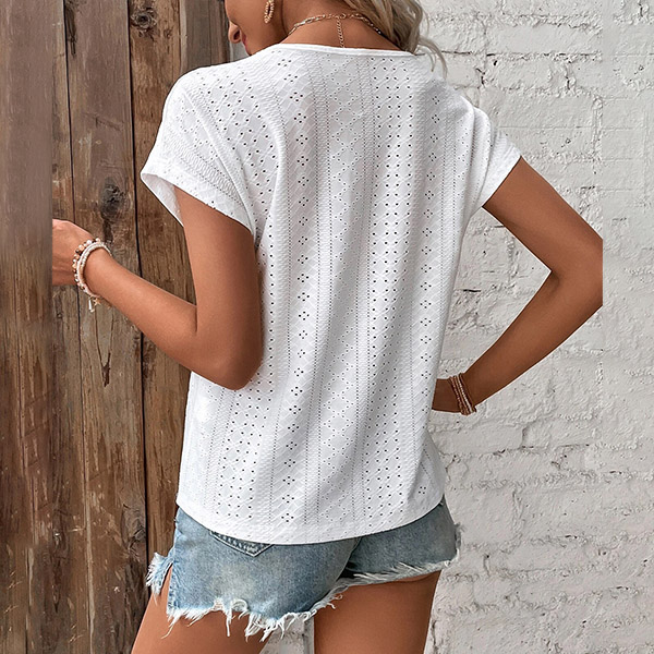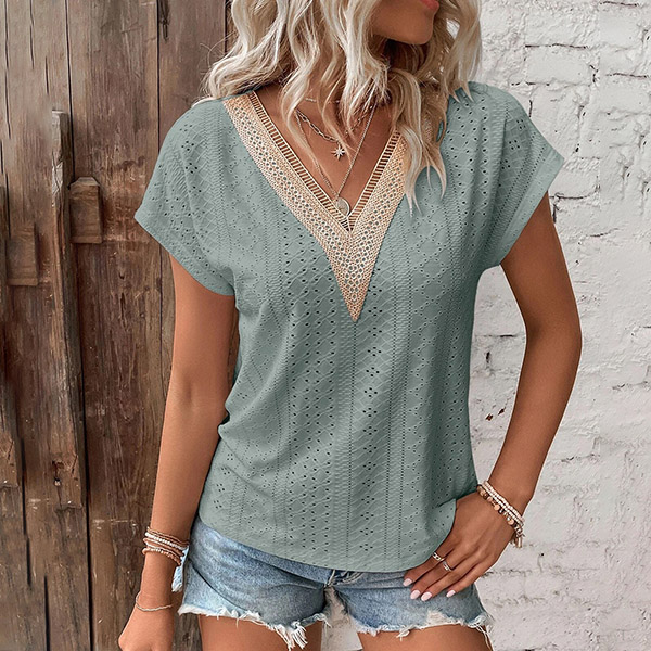 Casual Jacquard Lace Spliced V-neck Short Sleeve Shirt