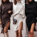 Casual Knitted Two-piece Set Consist of Turtleneck Shirt and Slit Skirt