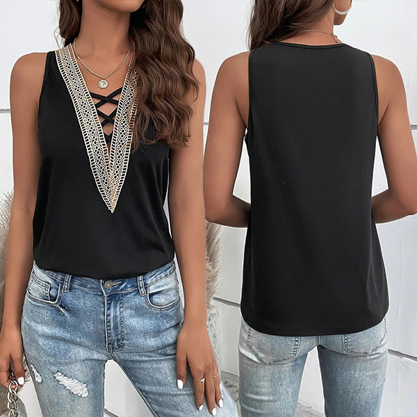 Cette chemise sans manches est fabriquée dans un tissu léger et respirant, parfait pour les temps chauds. Les épissures en dentelle ajoutent une touche d'élégance et de féminité à la chemise, tandis que les détails croisés sur l'encolure en V créent un look unique et accrocheur.