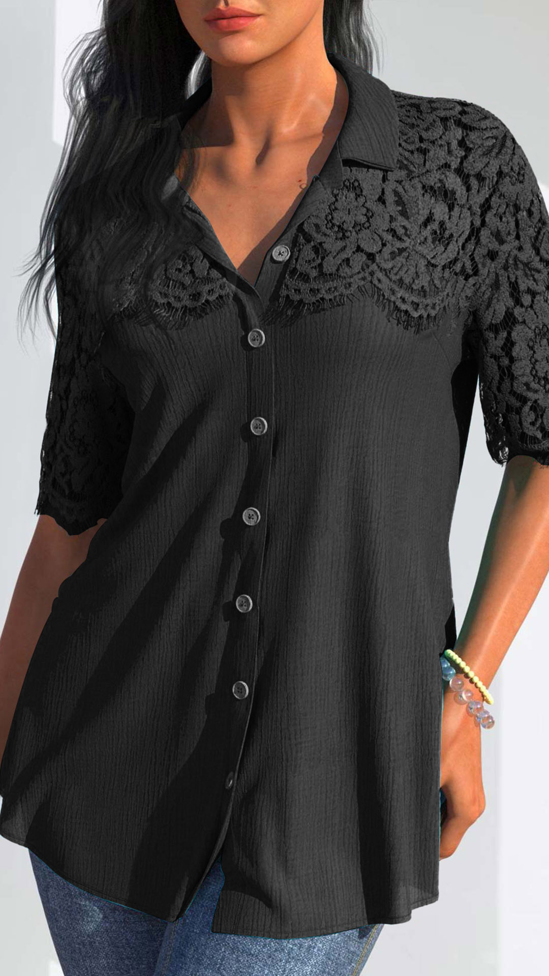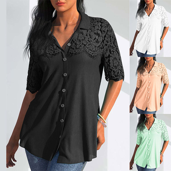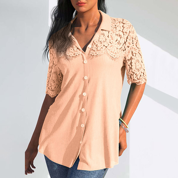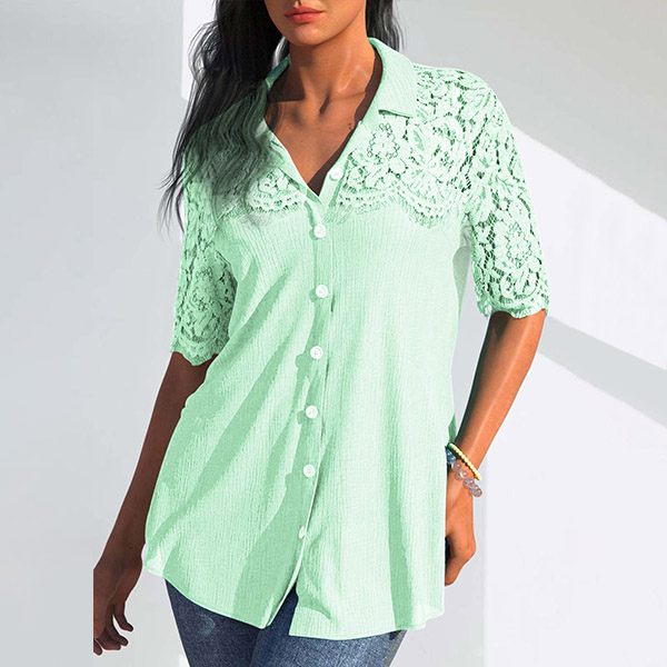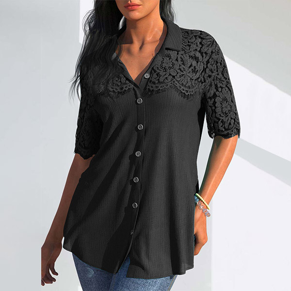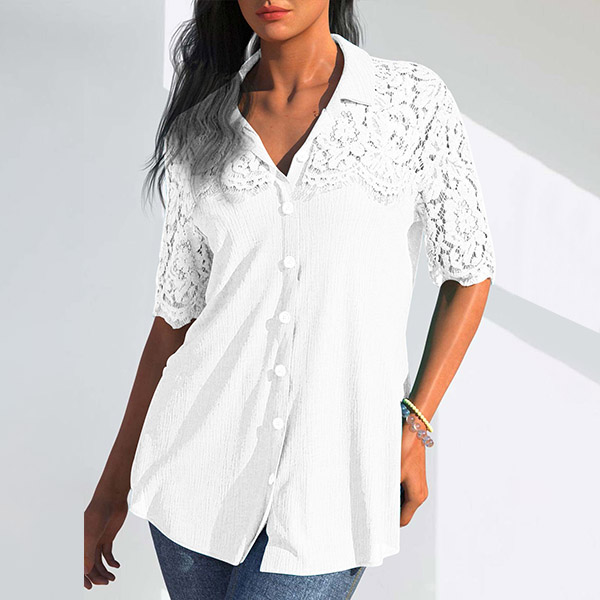 Casual Lace Spliced Short Sleeve Stand Collar Button Shirt