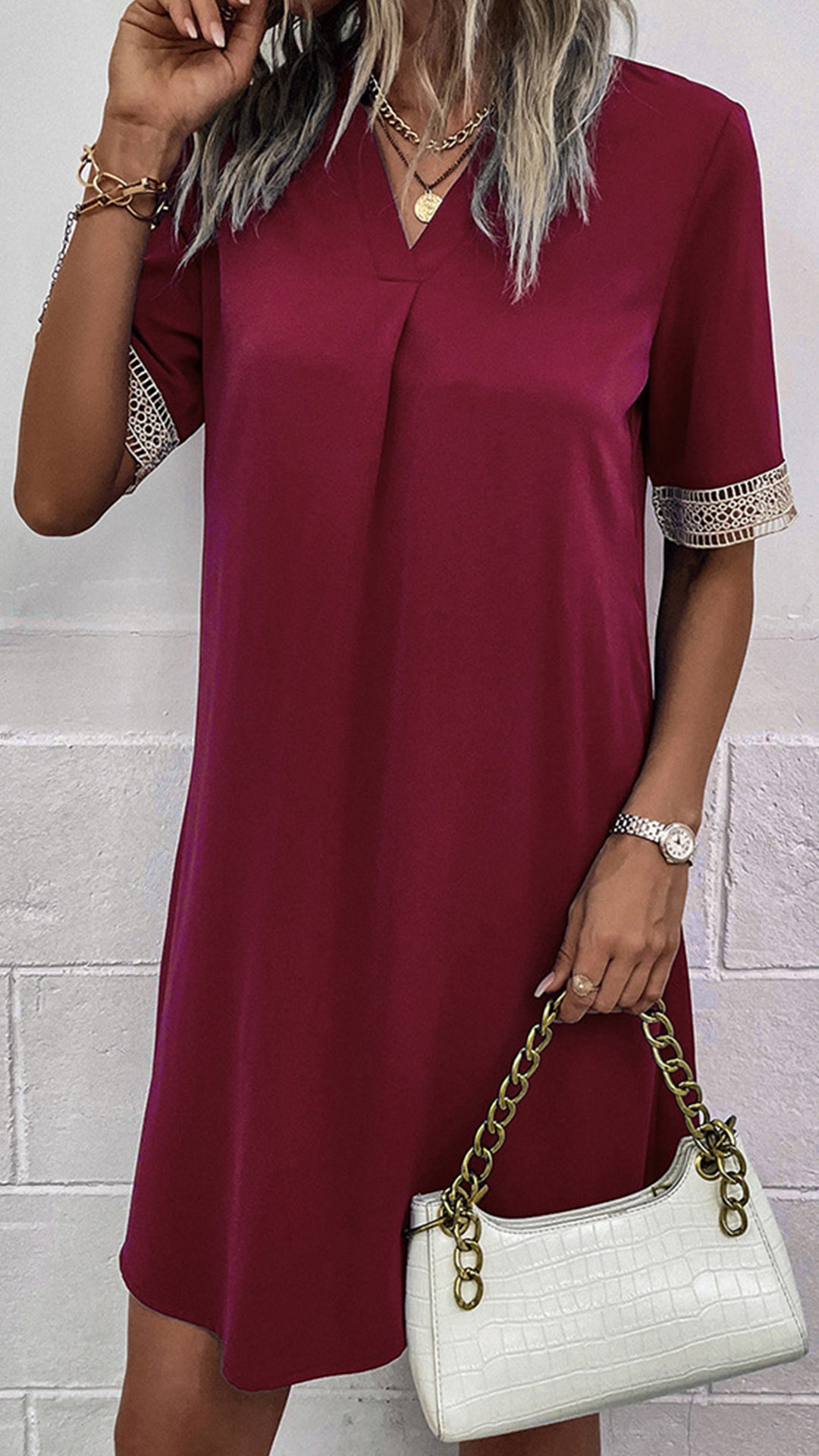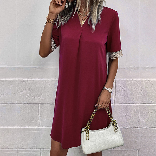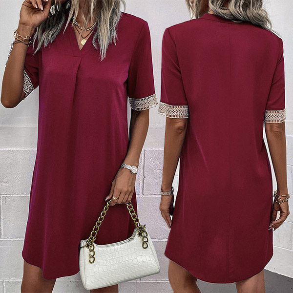 Look at this dress! The lightweight fabric is comfortable and breathable, making it perfect for warm summer days. The lace splicing along the sleeve hem adds a touch of femininity and elegance, while the V-neckline and mini length make it a flirty and fun choice. Wanna have a try?