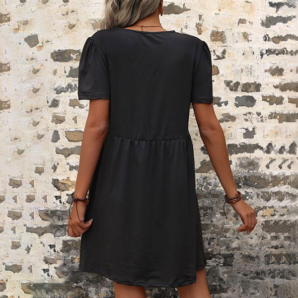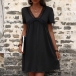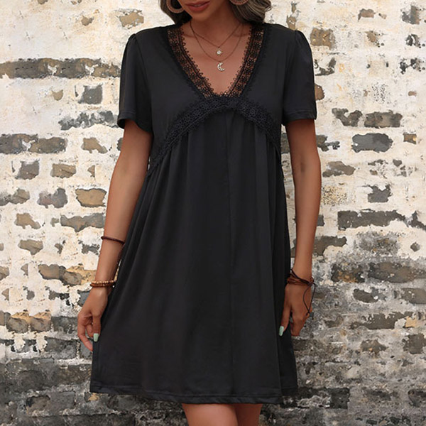 How about this casual dress? It features a delicate lace spliced design along the V-neck that adds a touch of elegance and allure. While the mini length adds a touch of playfulness and fun.