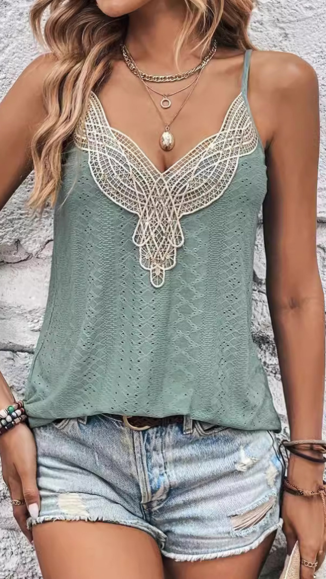 One of the standout features of this cami shirt is the lace-spliced detail along the V-neck, wanna have one?