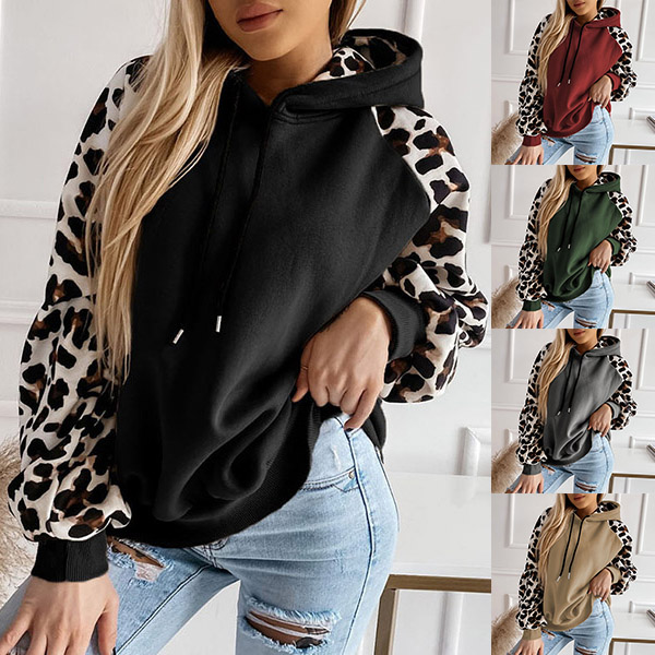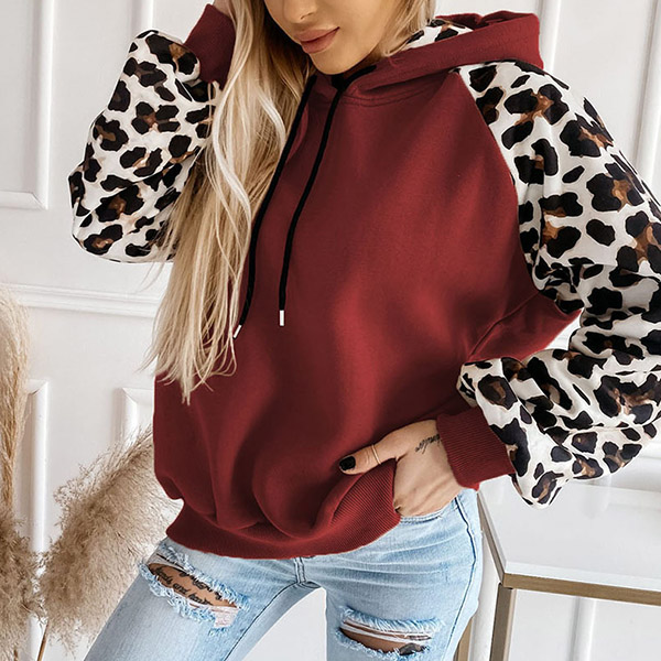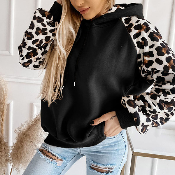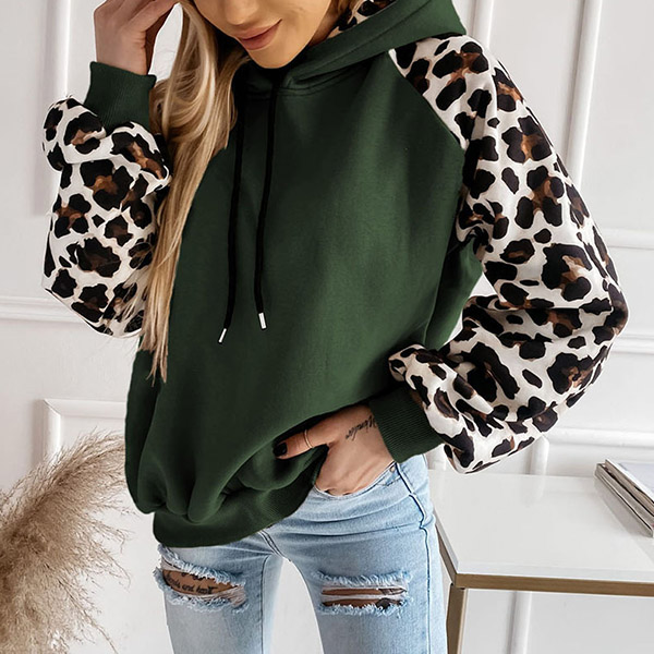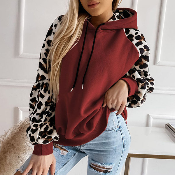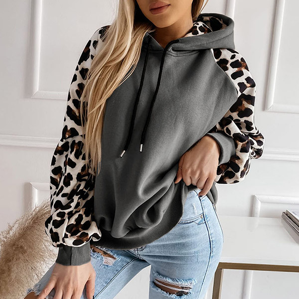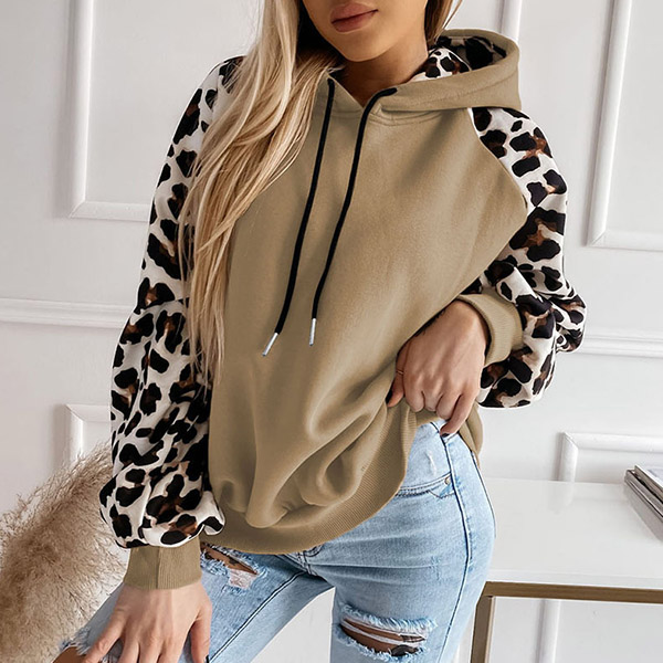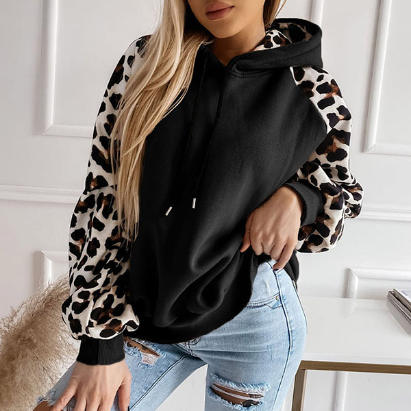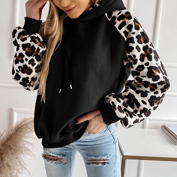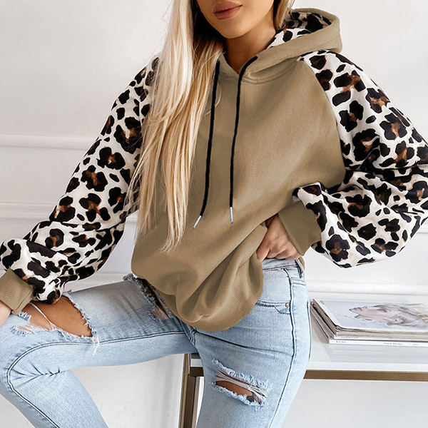Casual Leopard Print Long Sleeve Drawstring Hooded Sweatshirt